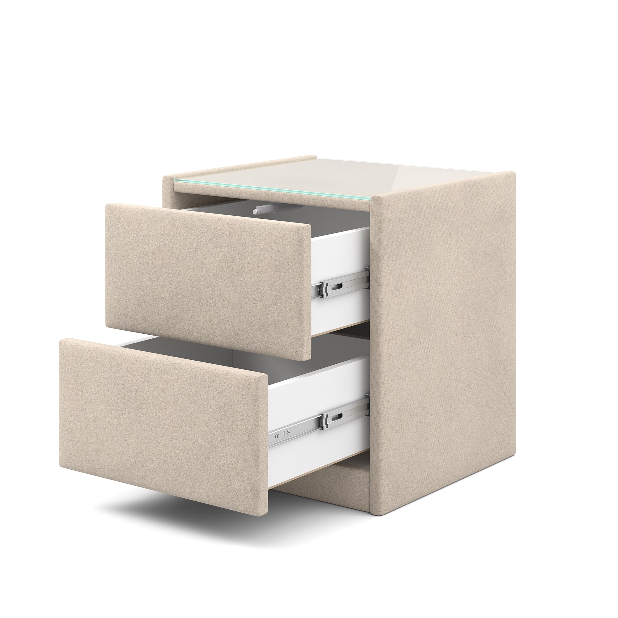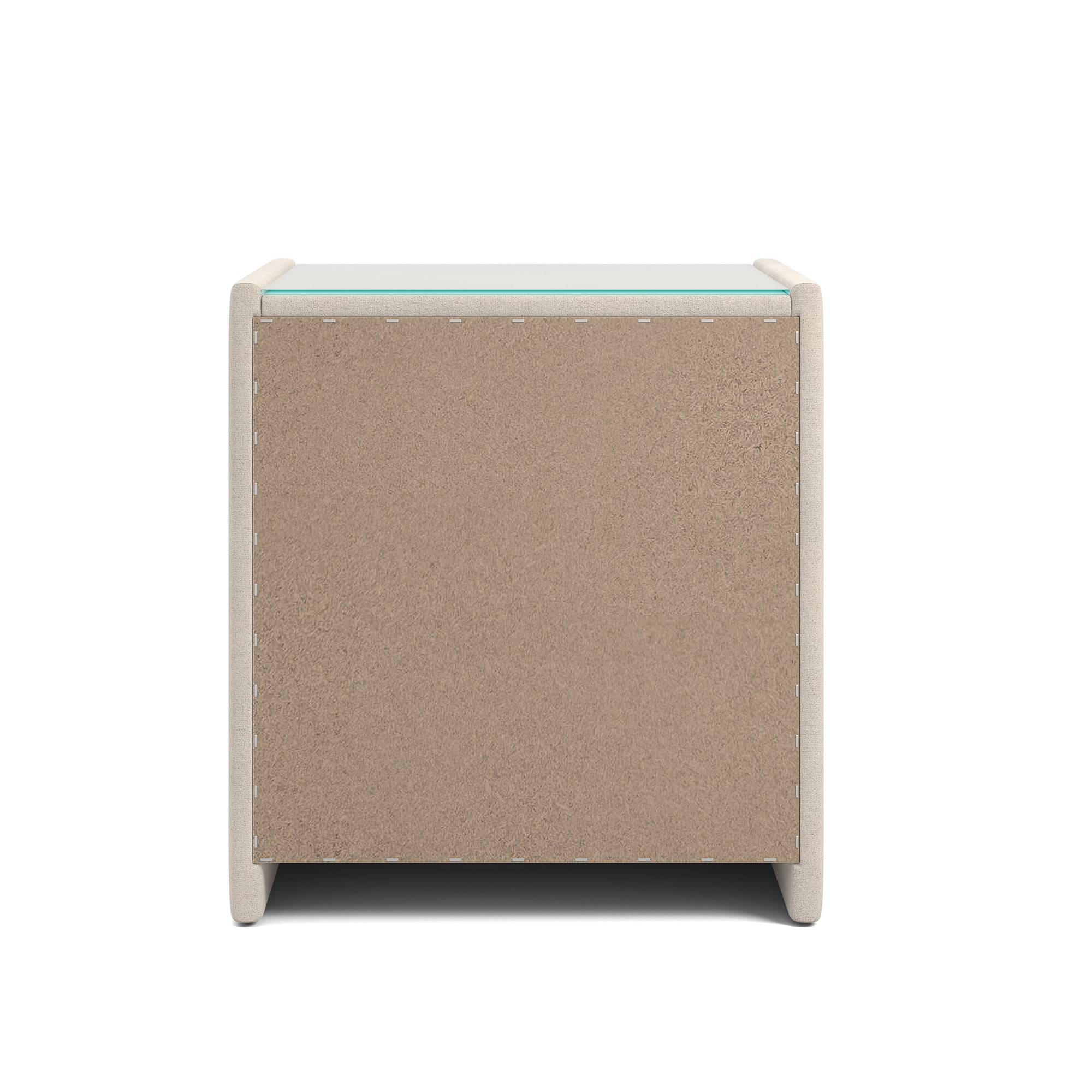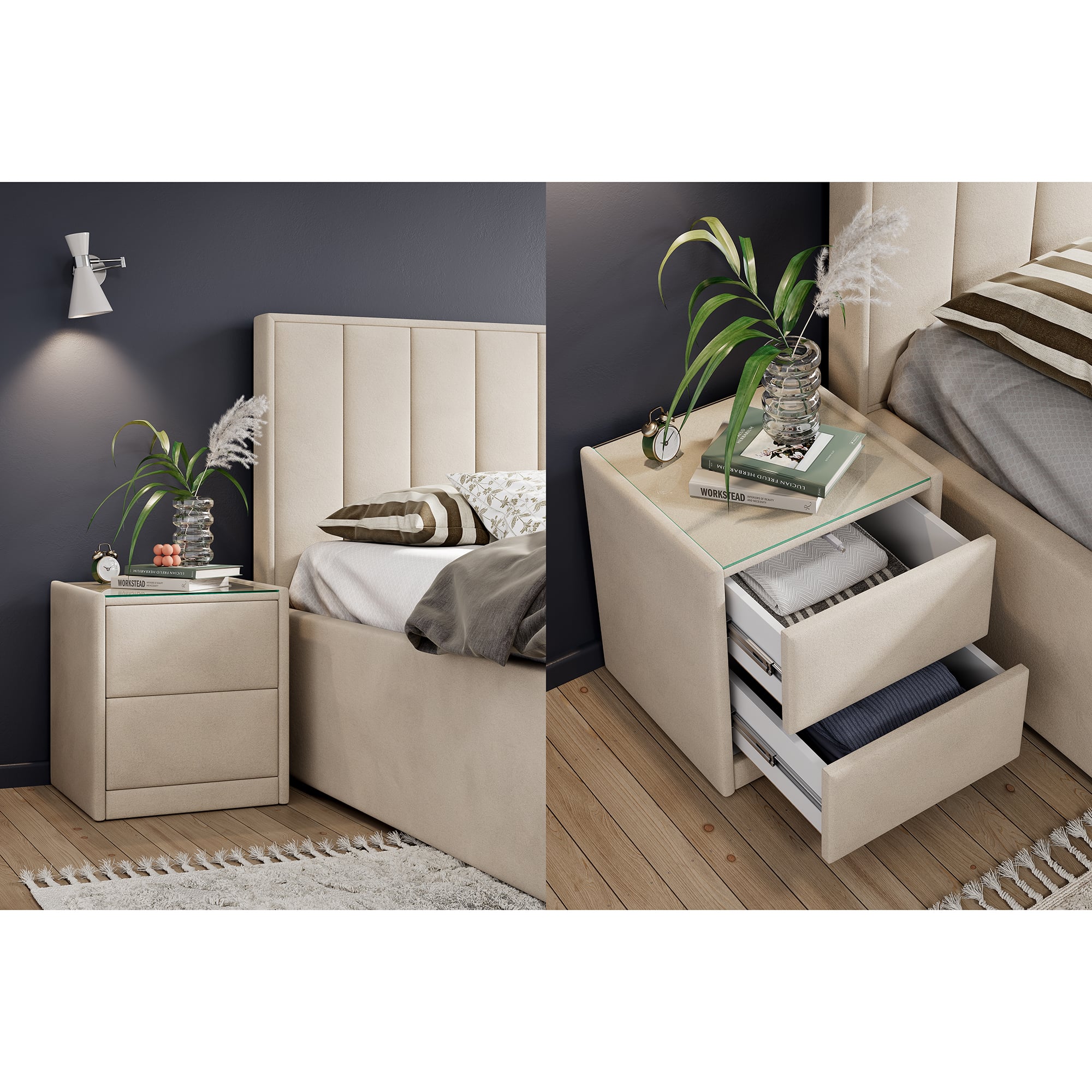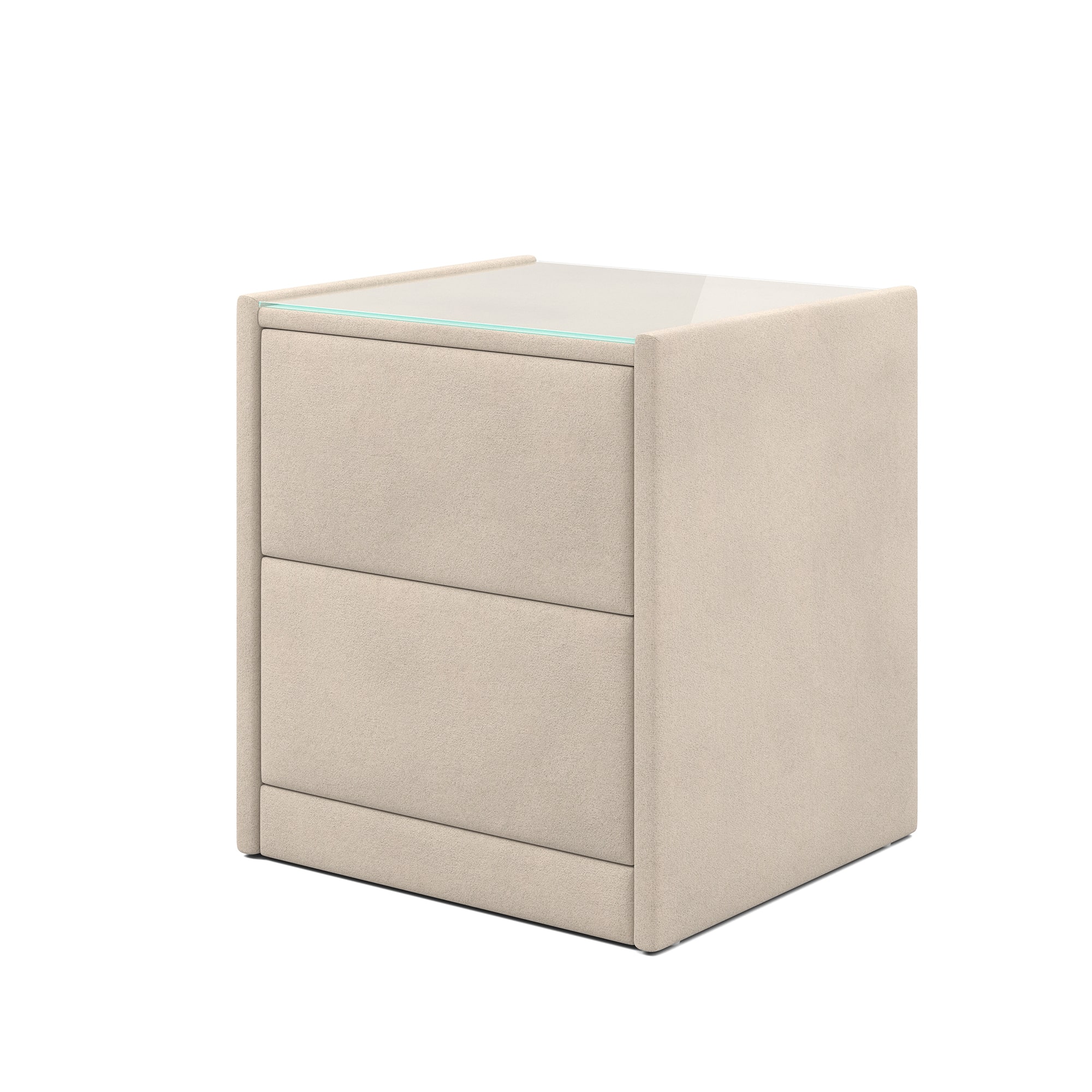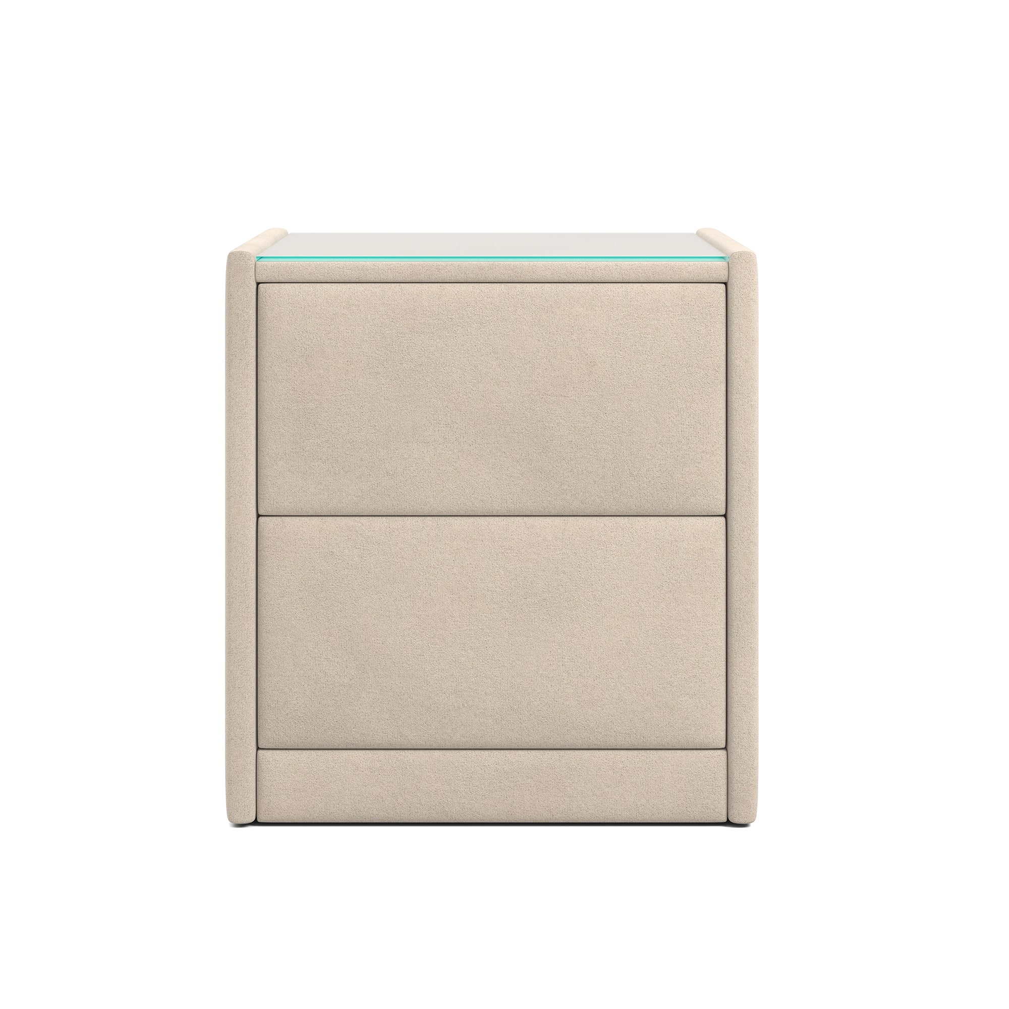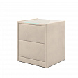 Тумба обтянута высококачественным велюром, что придает ей особый уют и комфорт. Имеет стеклянную столешницу и два вместительных выдвижных ящика с механизмом Push to open. Скругленные торцы модели, минимизируют риск удариться в темноте.