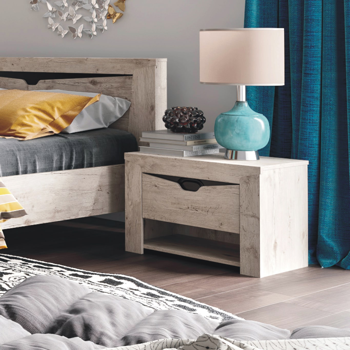 Прикроватная тумба "Соренто" имеет выдвижной ящик, для хранения мелких предметов, таких как пульт от телевизора, наушники, зарядные устройства. Открытое отделение тумбы позволяет хранить книги, журналы и другие предметы на видном месте. На фасаде имеется декоративный вырез, выполняющий функцию ручки.
