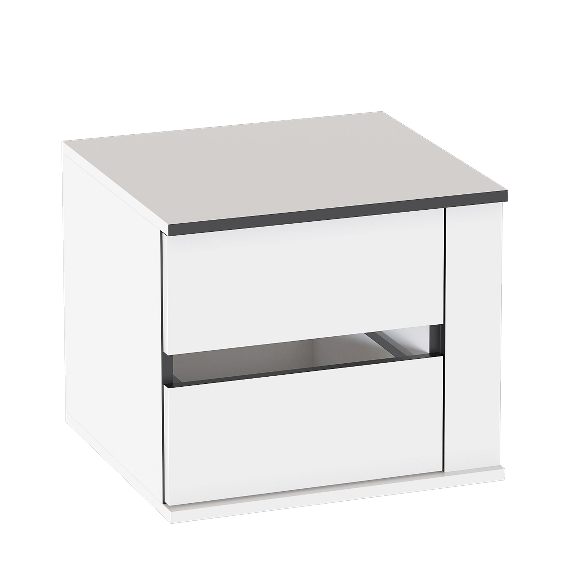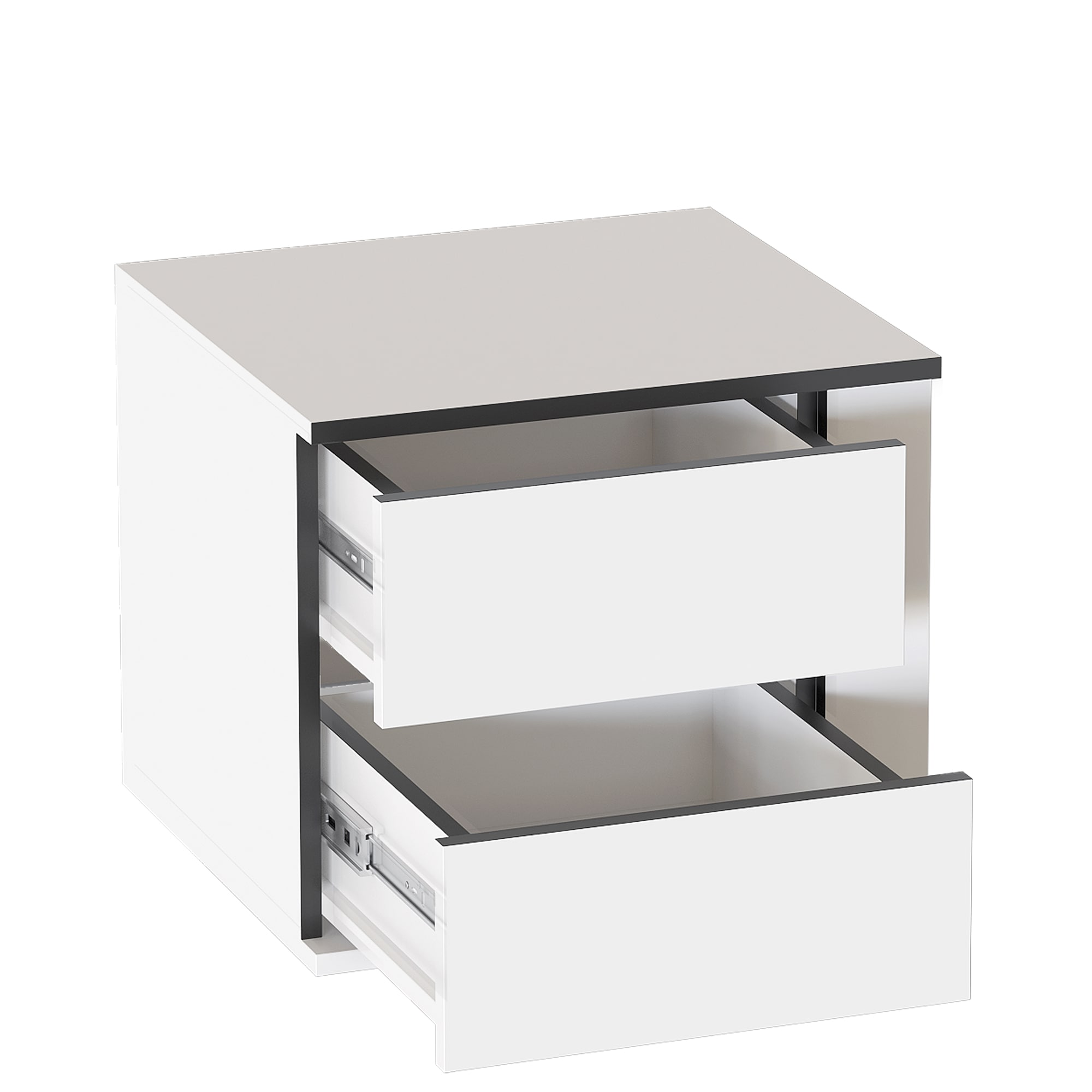 В комплект тумбы входит корпус с вкладными боками между которыми установлены два выдвижных ящика на шариковых направляющих.