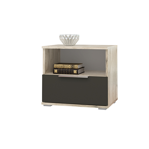 Тумба оснащена одним ящиком для хранения различных мелочей и аксессуаров. Матовая поверхность и серый цвет фурнитуры придают тумбе элегантный и современный вид.