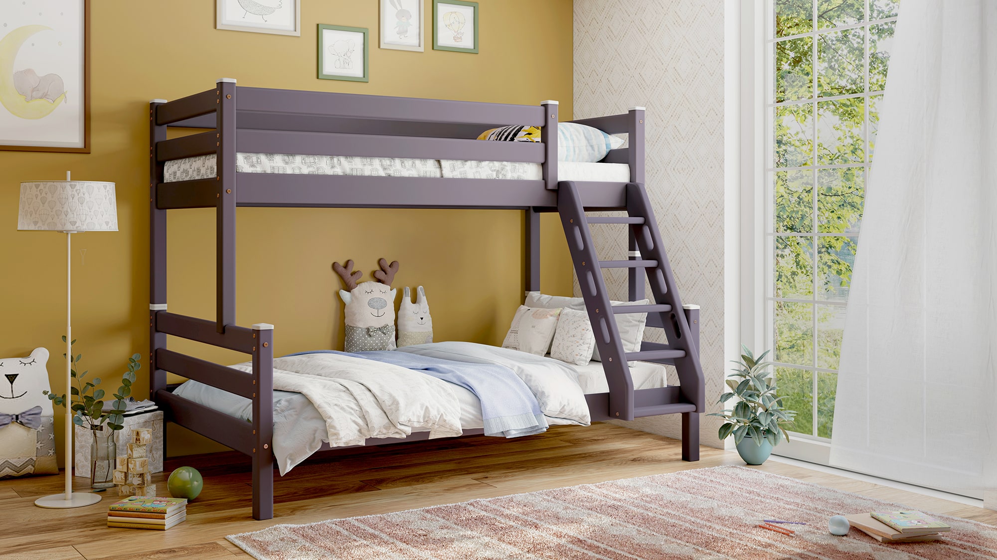 Продуманная конструкция и качественные материалы делают двухъярусную кровать Адель отличным выбором для двух детей, живущих в одной комнате. Модель оснащена бортиком безопасности и наклонной лестницей для легкого доступа к верхнему уровню.