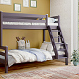 Увеличенное до 120 см по ширине спальное место нижнего яруса подходит для подростка, чей вес не превышает 70 кг. Верхнее основание имеет вид гнутых ламелей, с усиливающей перемычкой по периметру, нижнее представлено опорными брусками с уложенным поверх них настилом из шлифованного МДФ 10мм. Массив сосны подвергнут тщательной шлифовке и покрыт безопасным лаком на водной основе.