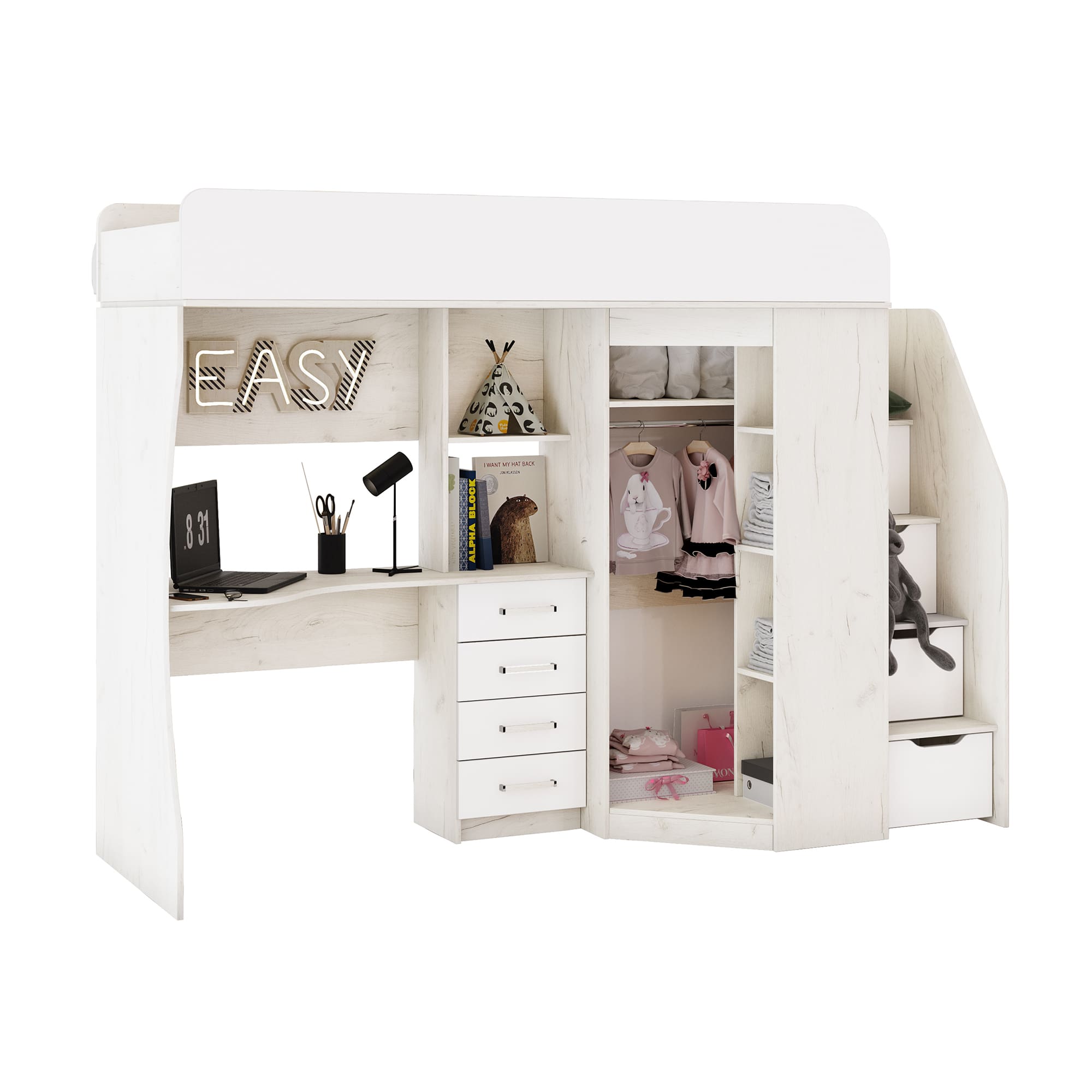 Кровать-чердак "Антилия" - удобное и практичное решение для детской комнаты, где каждый сантиметр на счету. Кровать-чердак совмещает в себе спальное место и рабочую зону для учебы или игр, а вместительный угловой шкаф позволят разместить все необходимые вещи. Комплект включает в себя компьютерный стол, что позволит ребенку комфортно заниматься уроками или творчеством. Благодаря компактности и функциональности, кровать-чердак станет идеальным выбором для малогабаритной детской комнаты.