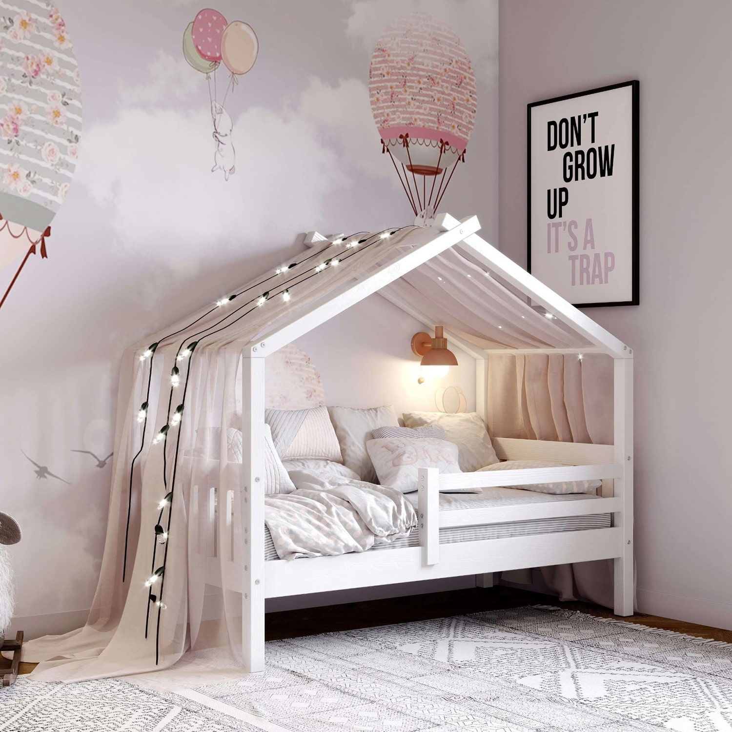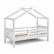 Каркас укомплектован основанием из поперечных гнутых ламелей. Головная и ножная спинки соединены стропилами, образующими крышу, благодаря чему малыш будет ощущать себя в собственном уютном домике. В комплектацию кровати входит ортопедическое основание из гнутоклееных ламелей.