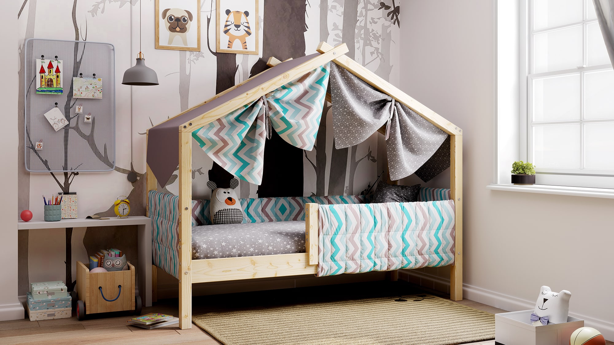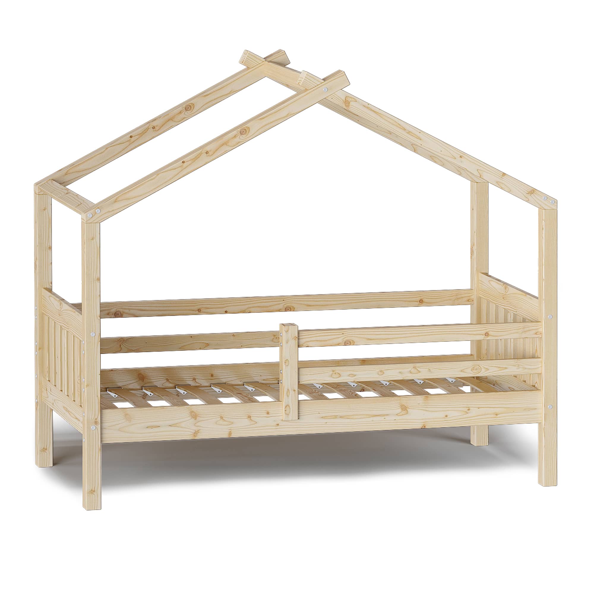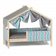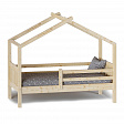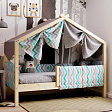 Каркас укомплектован основанием из поперечных гнутых ламелей. Головная и ножная спинки соединены стропилами, образующими крышу: если дополнить кроватку текстильными аксессуарами в виде балдахина и мягких бортиков, малыш будет ощущать себя в собственном уютном домике. В комплектацию кровати входит ортопедическое основание из гнутоклееных ламелей.
