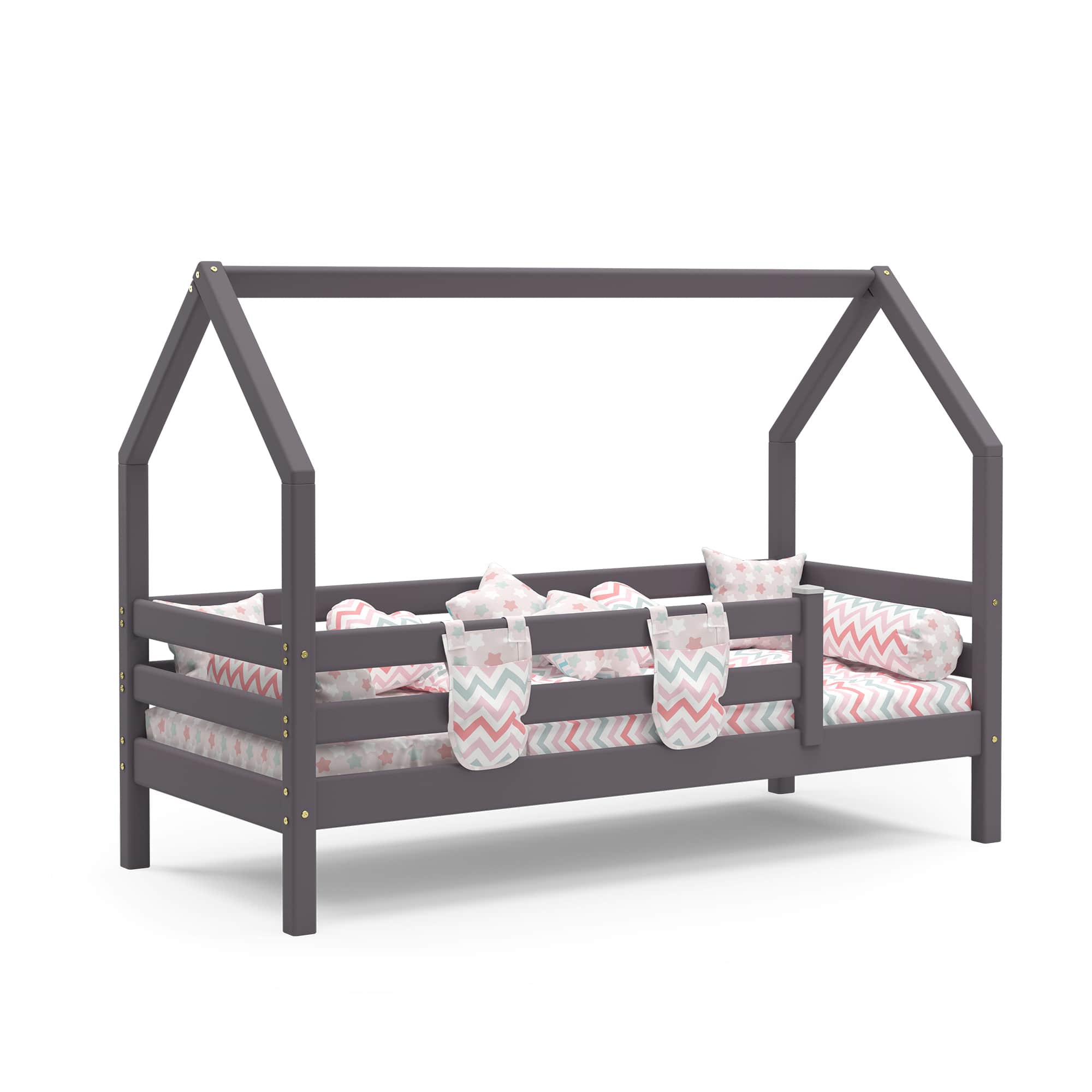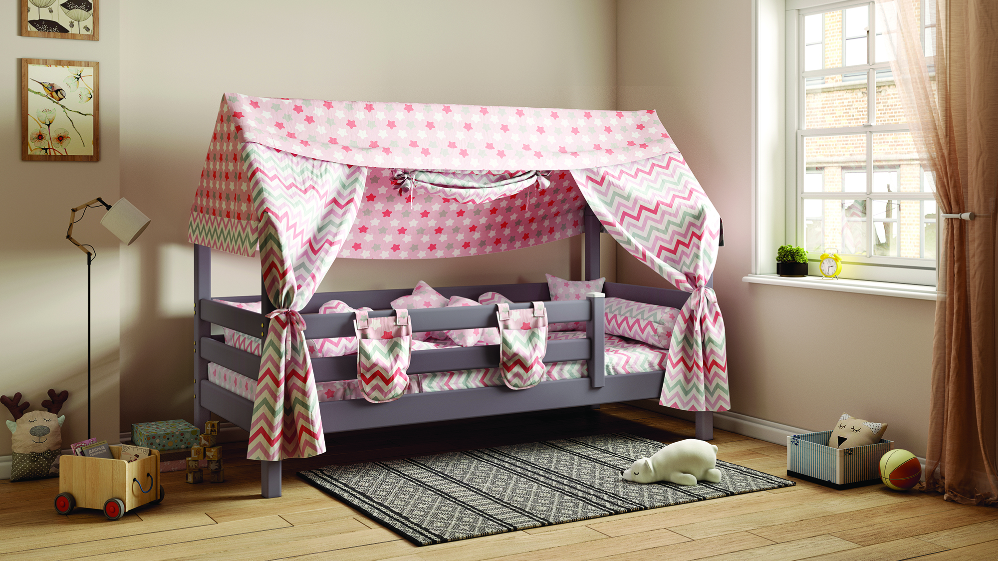 Уложить разыгравшегося ребенка бывает непросто – справиться с этой задачей поможет кроватка "Соня" с надстройкой в виде крыши домика. Дополненный текстильными элементами балдахин создает ощущение безопасности, настраивает на спокойствие, а в дневное время – может служить декорациями для пробуждающих воображение игр. Бортик по периметру защищает от случайного падения во сне. Собирается на обе стороны.