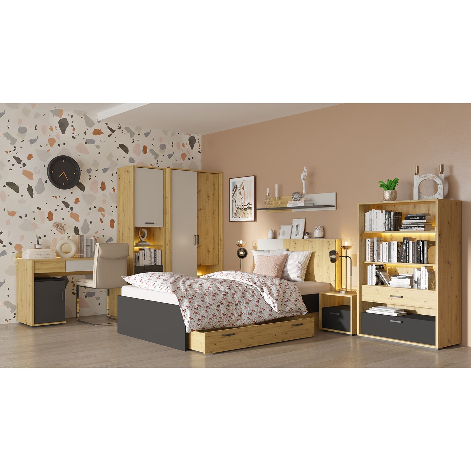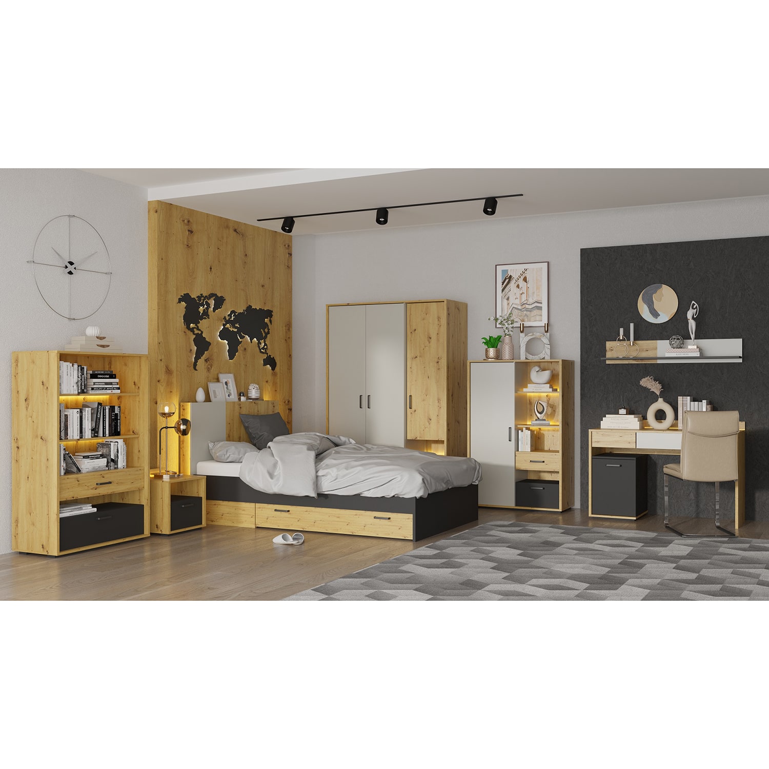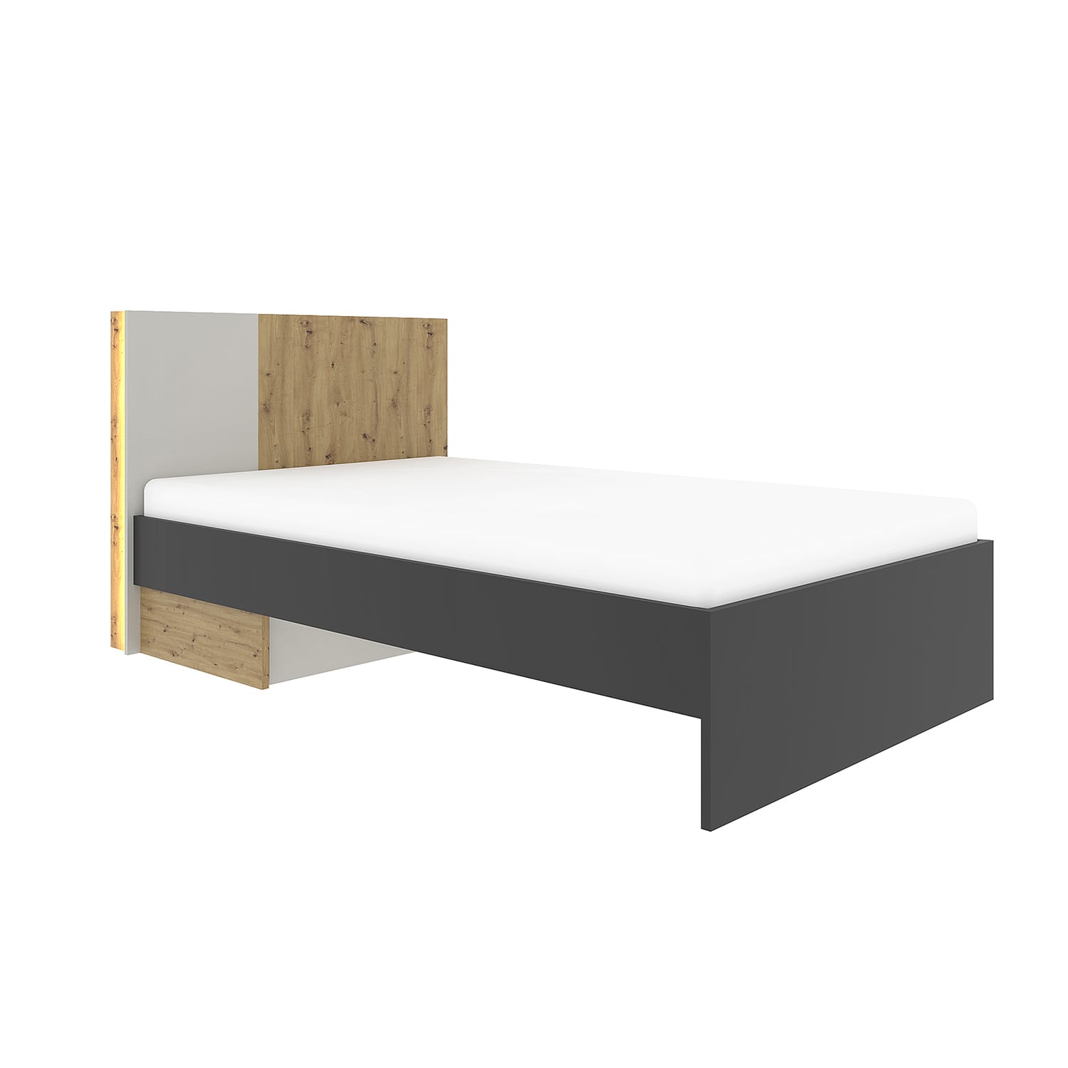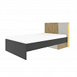 Кровать выполнена в цвете артизан/черный/серый, который прекрасно сочетается с различными интерьерами и создает уютную атмосферу. Материал каркаса – ЛДСП толщиной 16 мм, что гарантирует прочность и долговечность изделия.