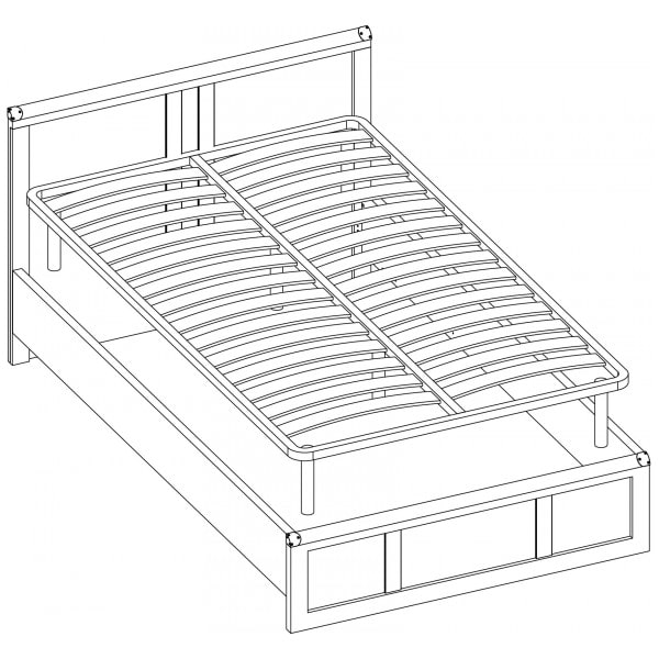 Кровать 120 MAGELLAN – полуторная, размер спального места – 1200*2000 мм. Конструкция кровати представляет собой сплошное изголовье и изножье прямоугольной формы с планками из ЛДСП, царги и металлическое основание на ножках (цельный металлический профиль с защитным покрытием (металлические ножки прикручиваются к основанию)). Деревянные ламели служат дополнительной амортизирующей основой.
