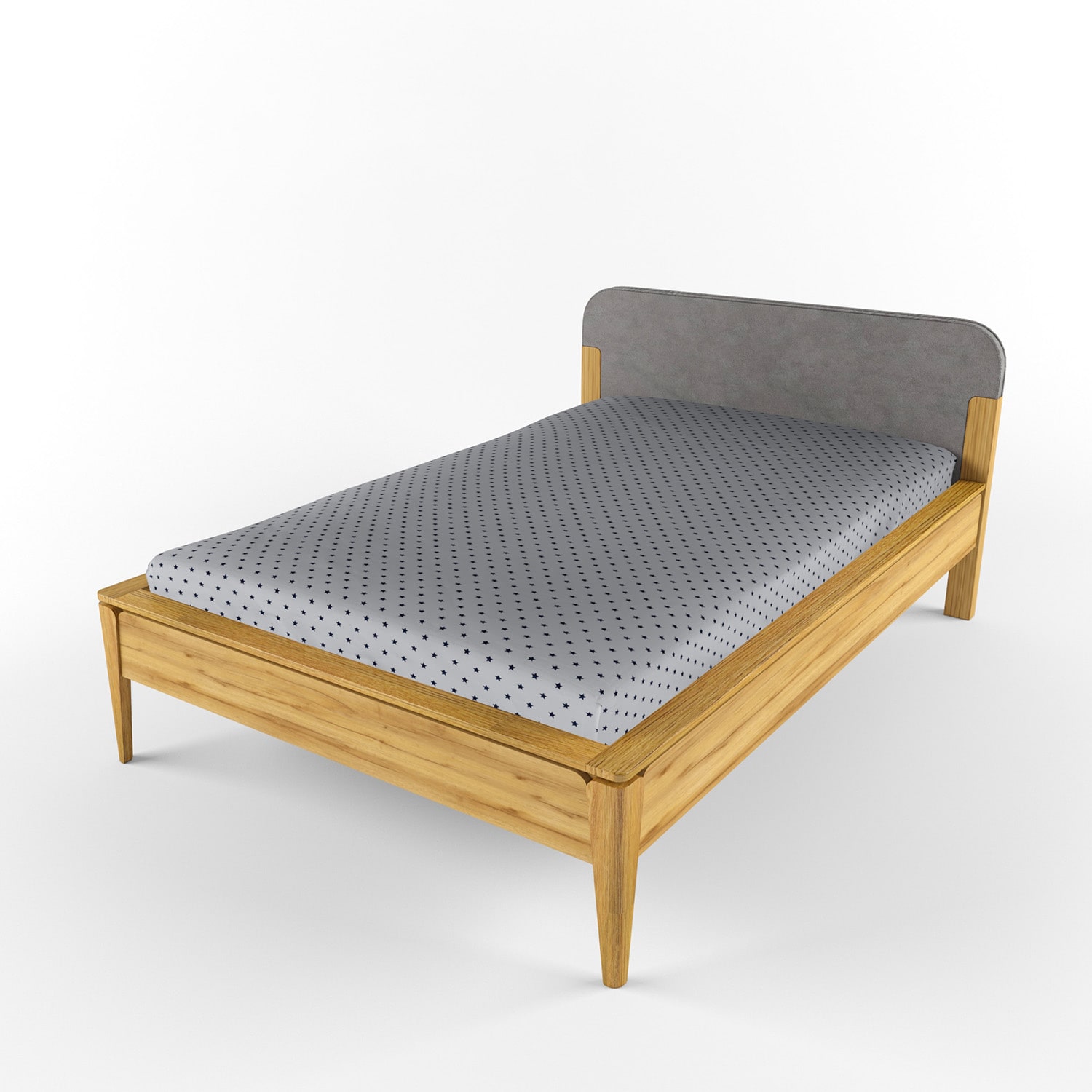 Кровать с мягким изголовьем создаст уютную атмосферу. Корпус и дно: ЛДСП 16 мм. Накладка на бортик: щит из массива дуба Опоры: массив дуба Изголовье кровати: ЛДСП 16мм + мягкая обивка из серого микровелюра. Усиленные кроватные стяжки.