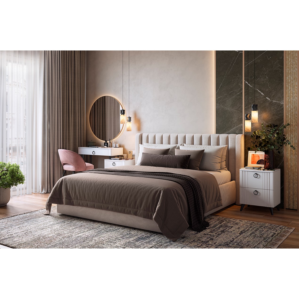 Обивка кровати выполнена из высококачественного велюра, который приятен на ощупь и добавляет шарма и элегантности вашей спальне. Вы можете выбрать один из множества цветов, таких как галька, графит, капучино, крем, латте, мята, пудра или топаз, чтобы соответствовать вашему личному стилю и предпочтениям.