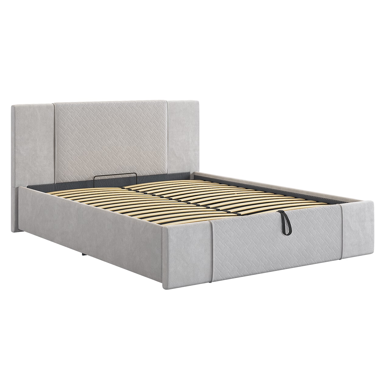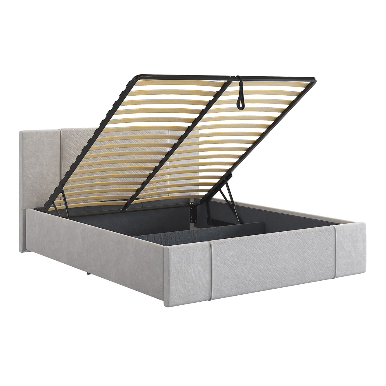 Подъемный механизм позволяет легко поднять верхнюю часть кровати и использовать вместительный ящик для хранения белья или других вещей.