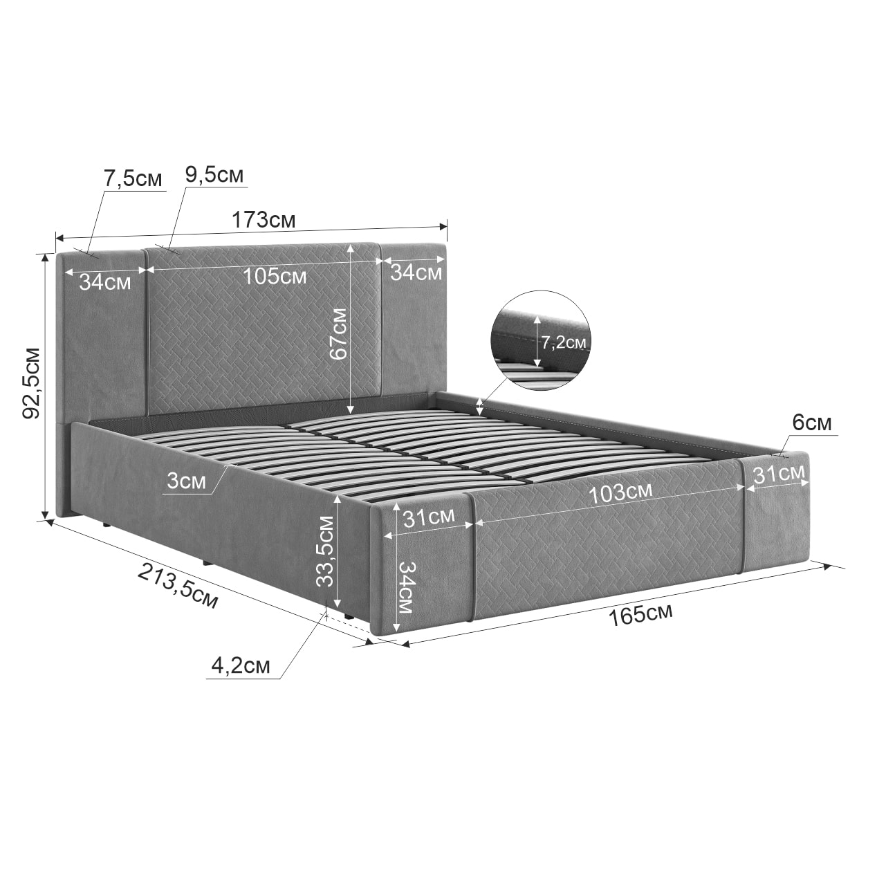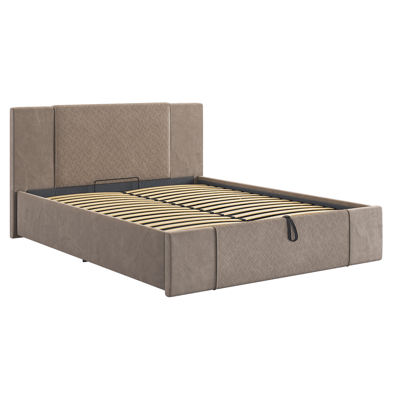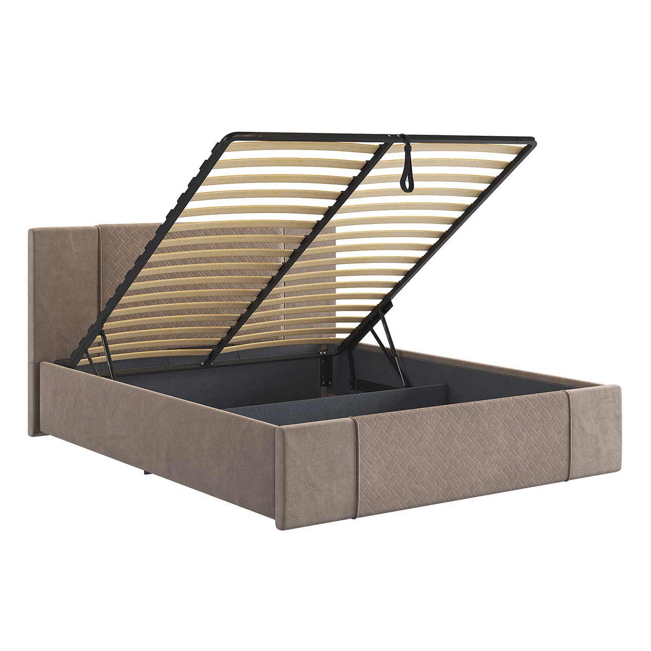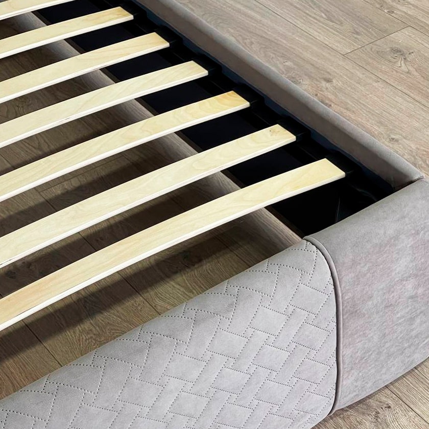 Подъемный механизм позволяет легко поднять верхнюю часть кровати и использовать вместительный ящик для хранения белья или других вещей.