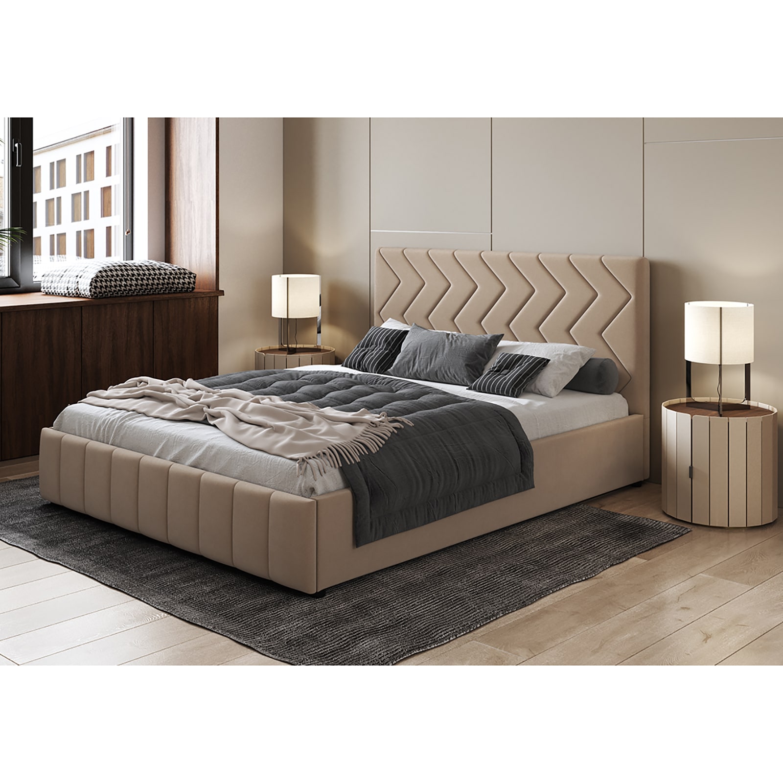 Интерьерная кровать МИЛАНА выполнена в благородном велюре, что подчеркивает объем и геометрию стежки.