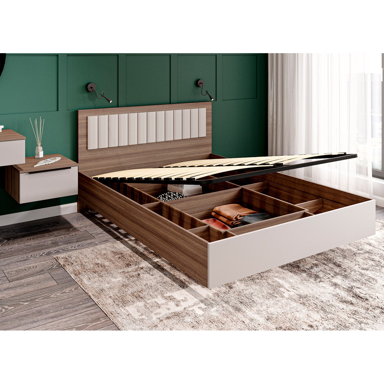 Ортопедическое основание кровати установлено на газлифтах, что позволяет легко поднимать и опускать основание, а также использовать отсеки для хранения вещей. Отсеки находятся под кроватью и обеспечивают дополнительное пространство для хранения постельного белья, одежды, обуви и других вещей, что позволяет сэкономить место в комнате.
