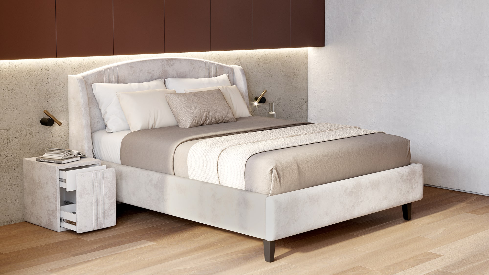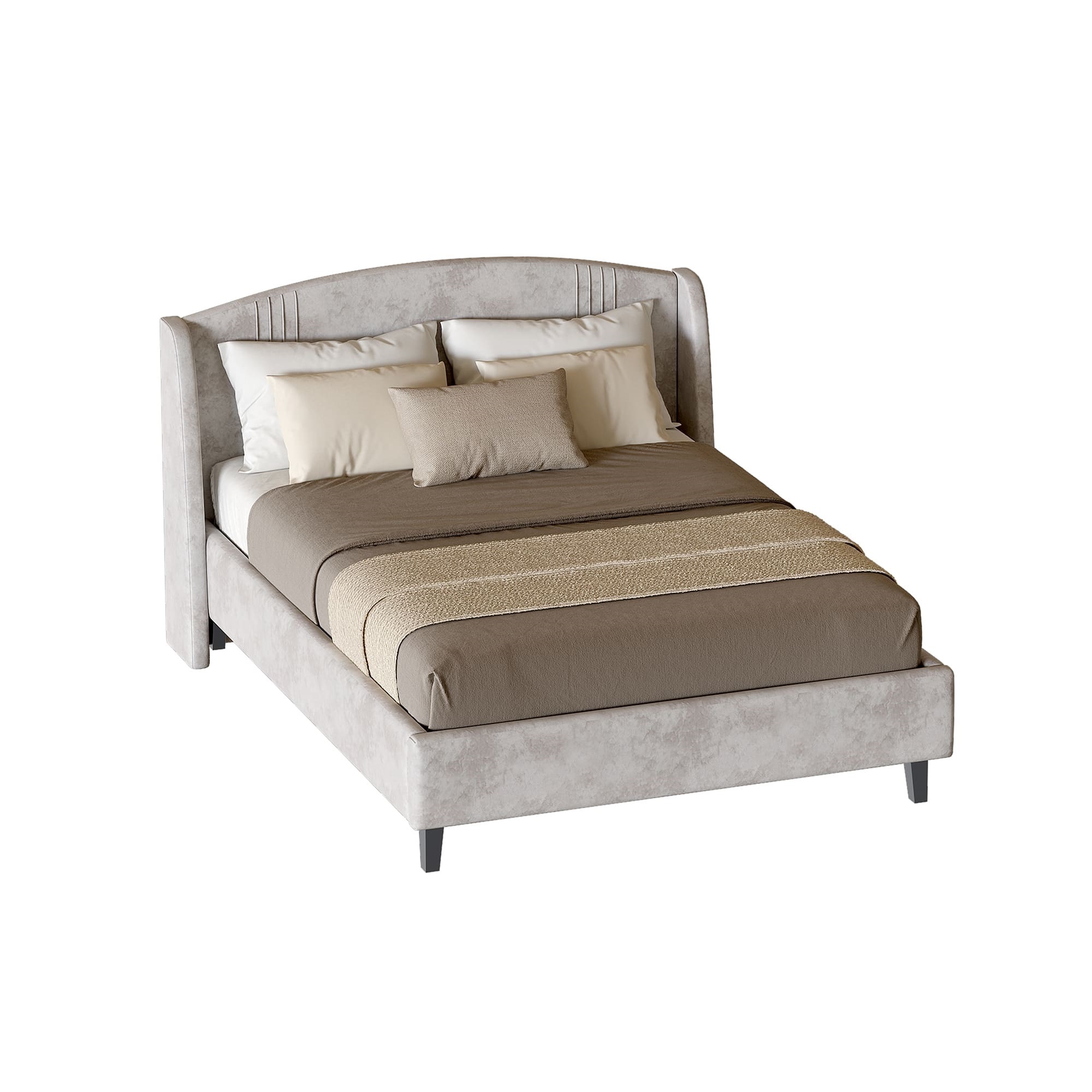 Каркас кровати обит мягким и приятным на ощупь велюром, который хорошо держит форму, устойчив к механическим воздействиям (в том числе к зацепкам от когтей животных), гипоаллергенен.