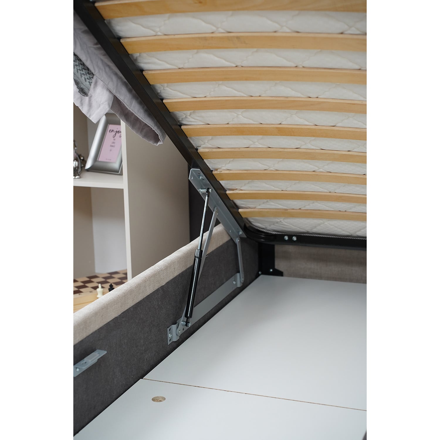 В комплектацию каждой кровати входит ортопедическое основание с подъемным механизмом, ящики со дном из ЛДСП.