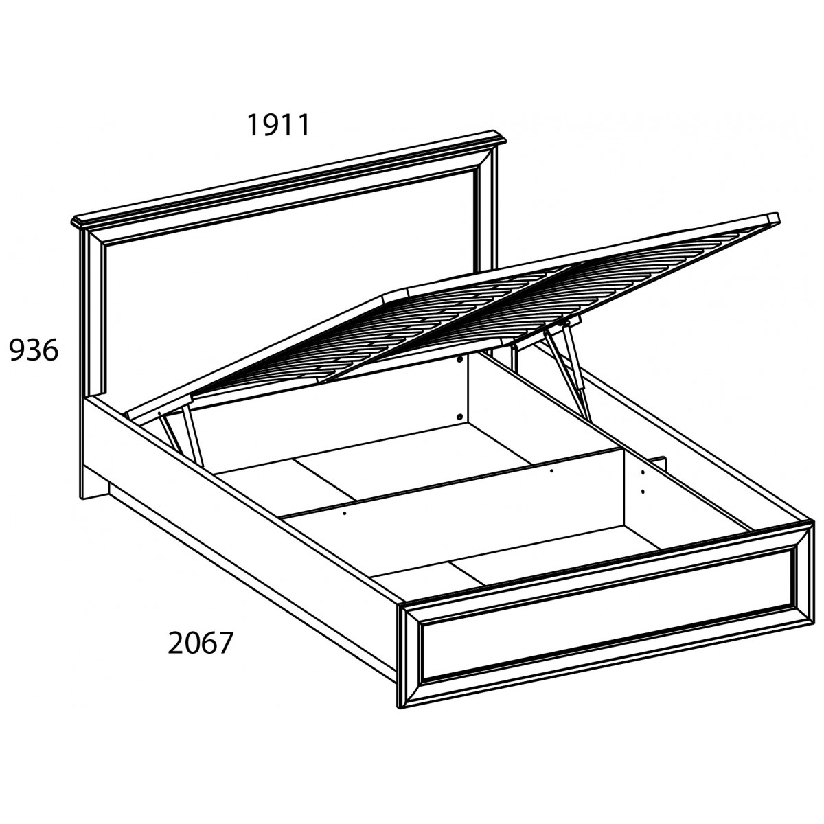 Конструкция кровати представлена сплошным изголовьем прямоугольной формы (с патинированными планками, декоративной короной) и изножьем прямоугольной формы (обрамлённое патинированными планками из МДФ), царгами и металлическим основанием с подъёмным механизмом, большими удобными ящиками для хранения вещей, белья и предметов быта. Деревянные ламели служат дополнительной амортизирующей основой.
