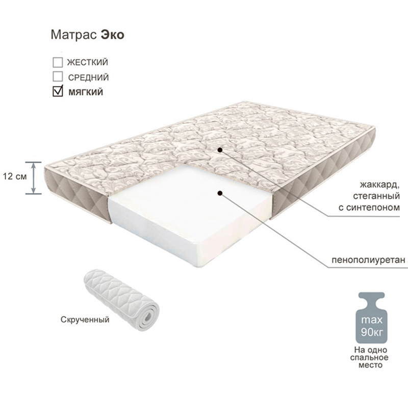 Синтепон: гипоаллергенный материал из полиэфирных волокон, обеспечивает высокую упругость и износостойкость. Обладает теплоизоляционными свойствами, придает матрасу мягкости и объема.