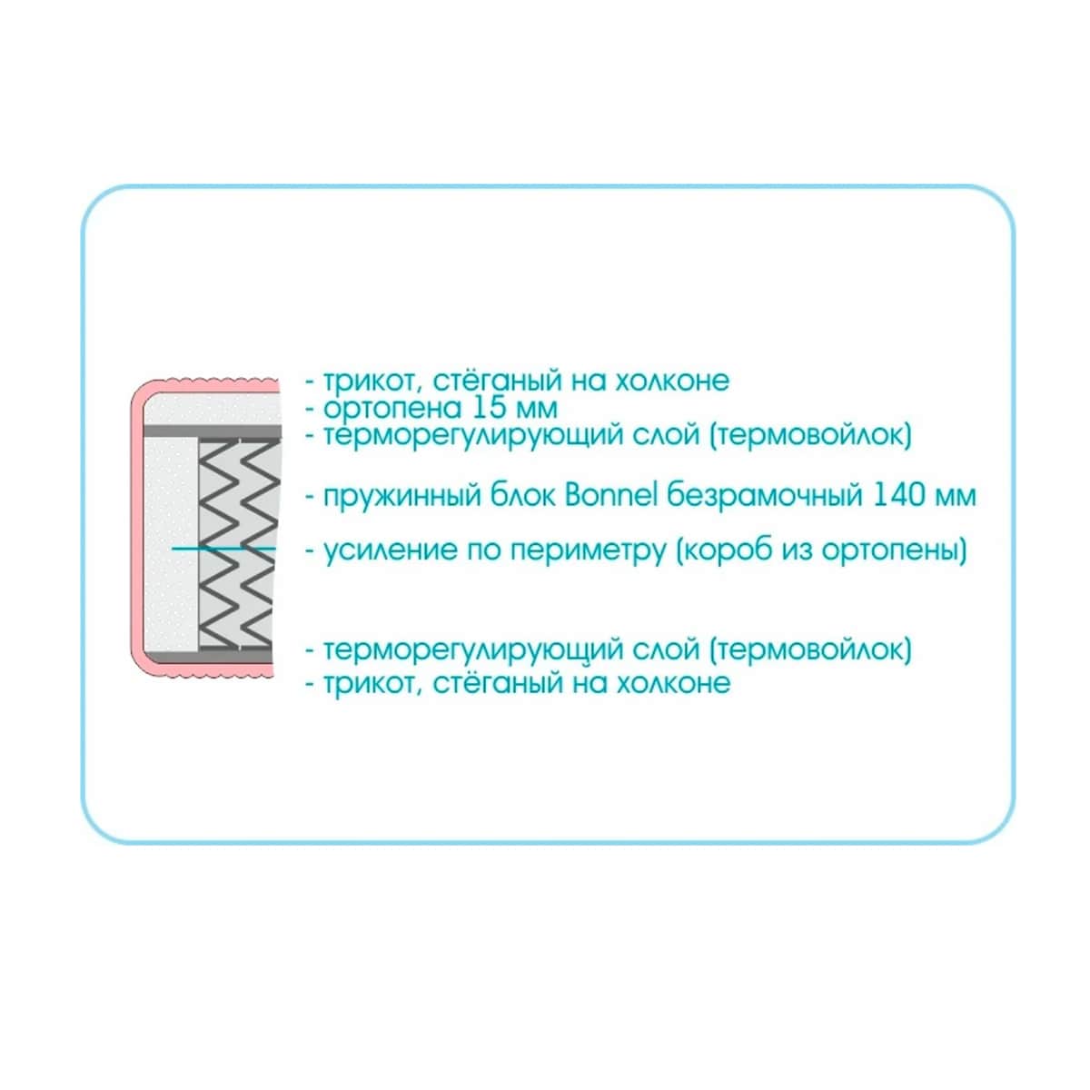 Слой ортопены надежно защищен от истирания слоем термовойлока, находящемся между ним и пружинным блоком, тем самым значительно продлевается срок службы матраса.