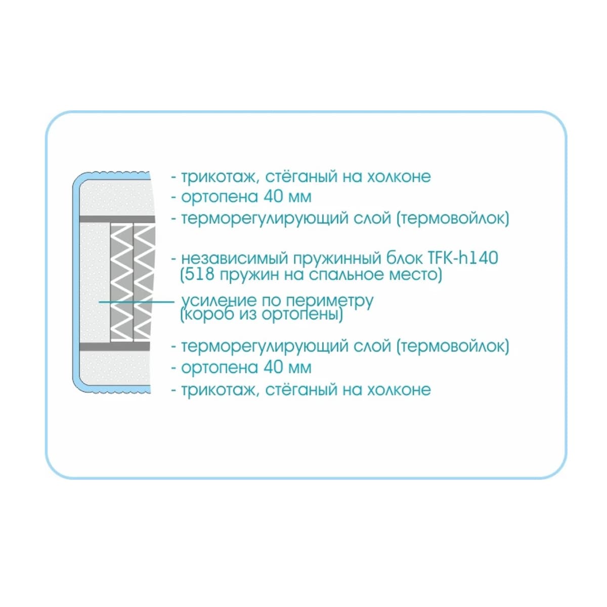 В составе комфортного слоя лежит увеличенный слой ортопены, который снимает нагрузку и поддерживает область поясницы. Сочетание наполнителя и независимых пружин обеспечивает глубокий и комфортный сон.
