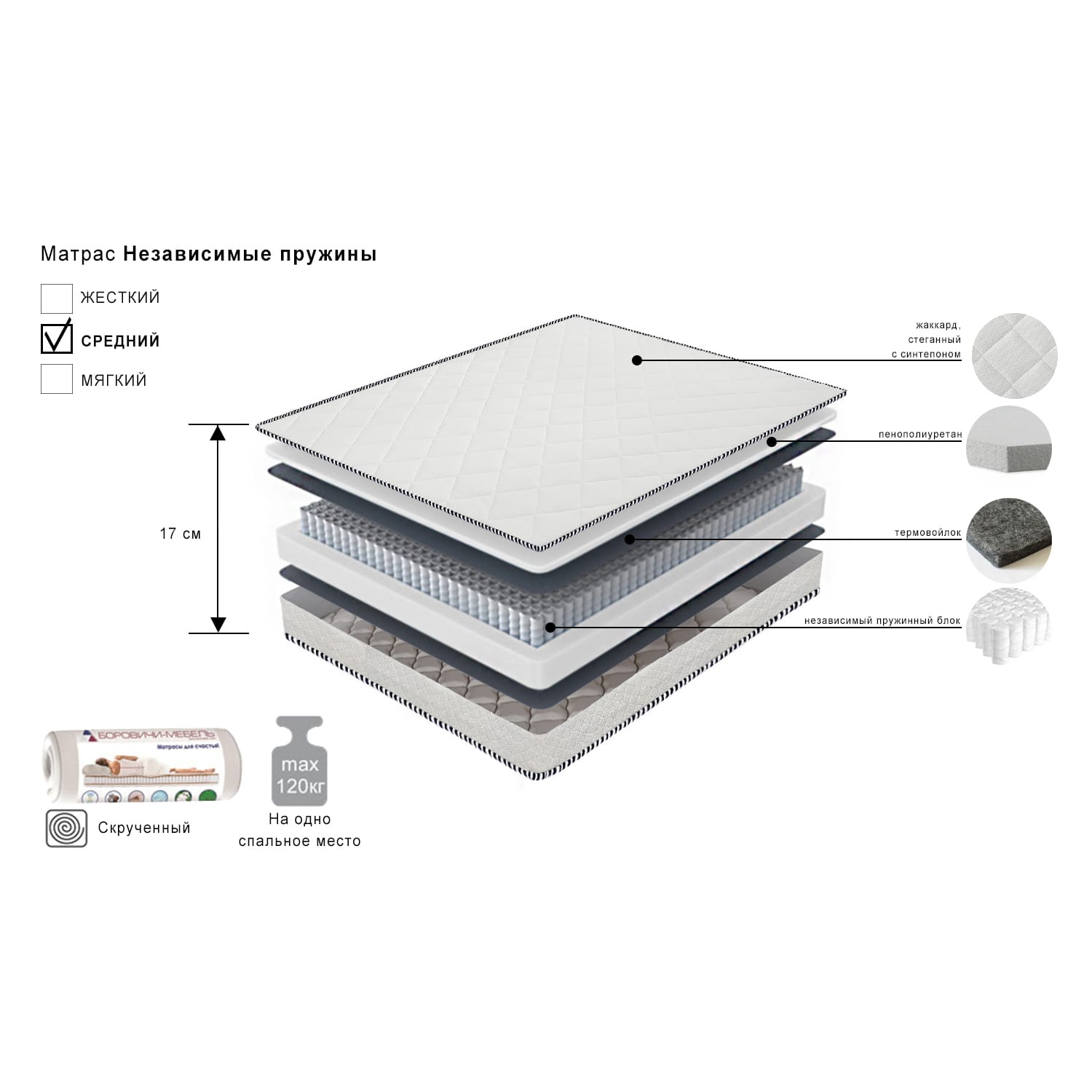 Блок независимых пружин: пружины в блоке имеют форму бочонка и находятся в отдельном пакете, который заключен в отдельные пакеты из файбертекса, засчет этого пружины работают независимо друг от друга, что придает матрасу ортопедический эффект.