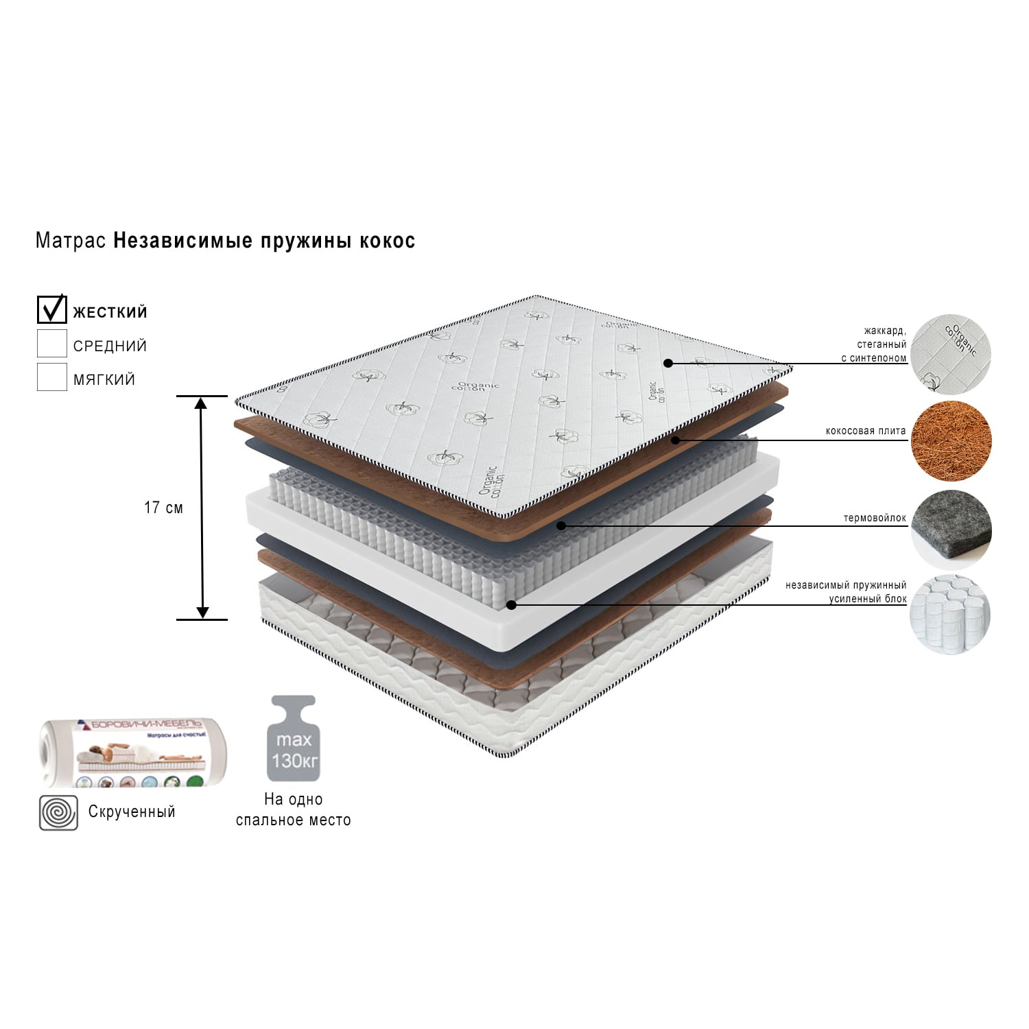 Чрезвычайно прочен и долговечен. Обладает хорошей вентилируемостью. Придает матрасу жесткость и упругость.