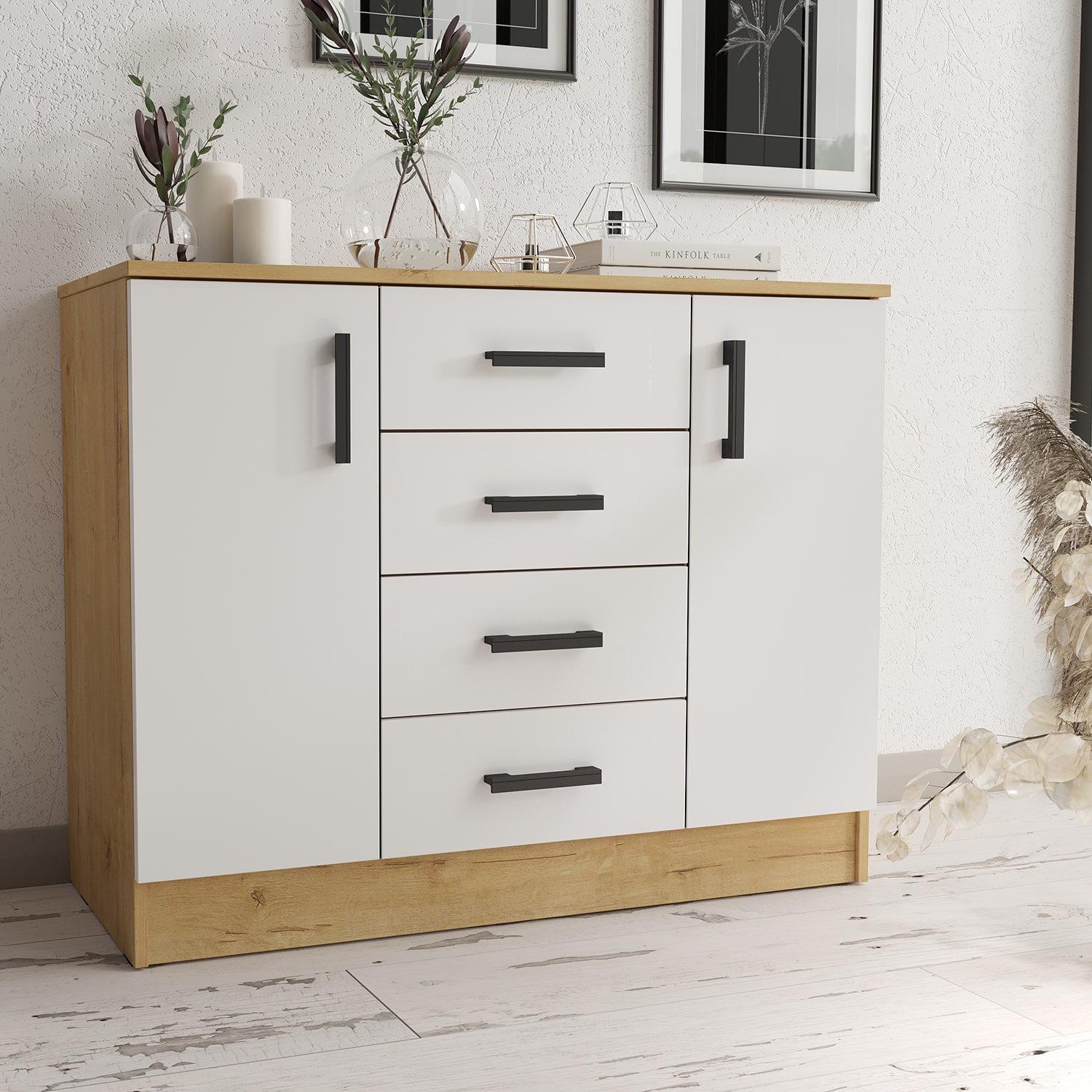 4. Комод К 1000-2Д Дуб Вотан-Белый гладкий (1000x440x830 мм)