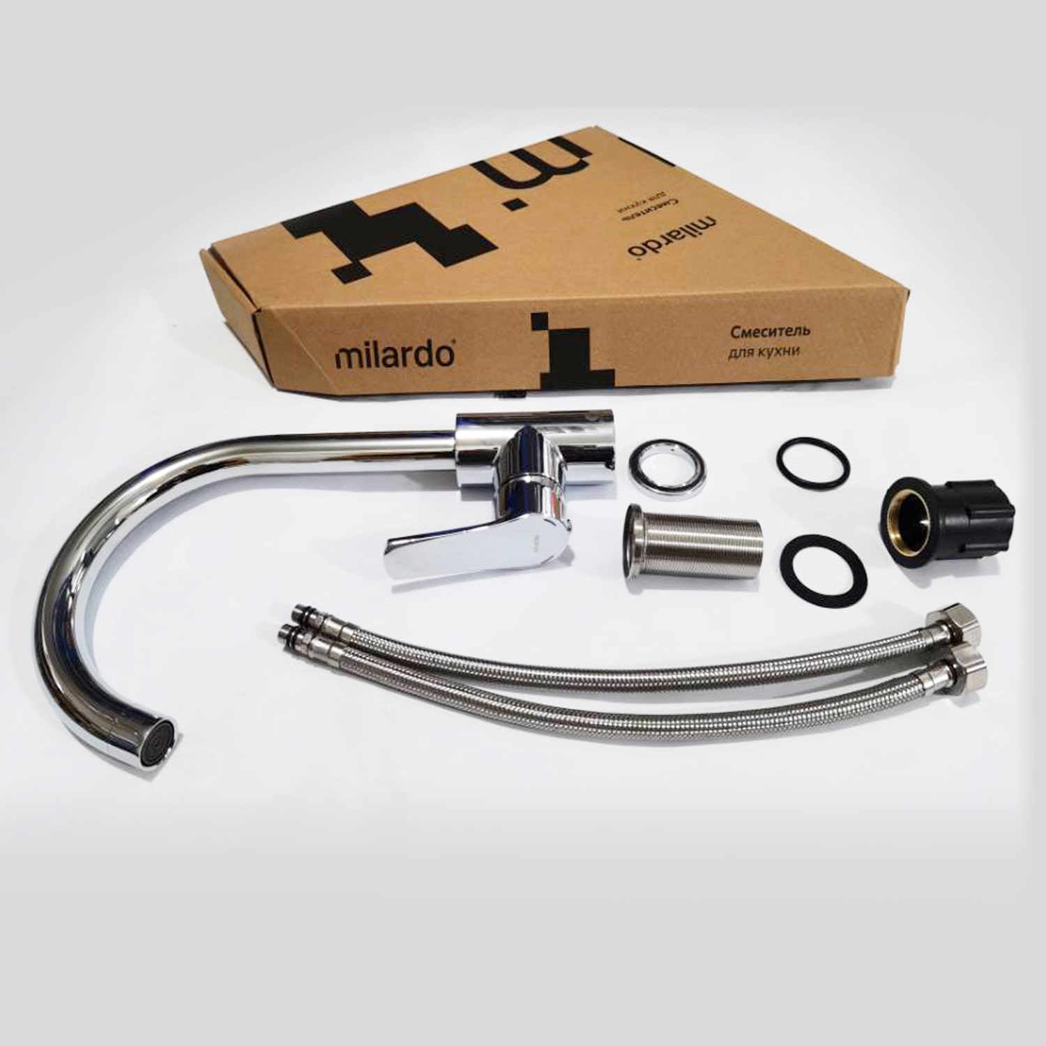 Смеситель для кухни, однозахватный, латунь, цинк, нержавеющая сталь, никель-хромовое покрытие, цвет - хром, керамический картридж 35 мм, пластиковый аэратор. В комлекте: гибкая подводка, крепёж. Упаковка: коробка, микрогофрокартон, индивид. мешок.