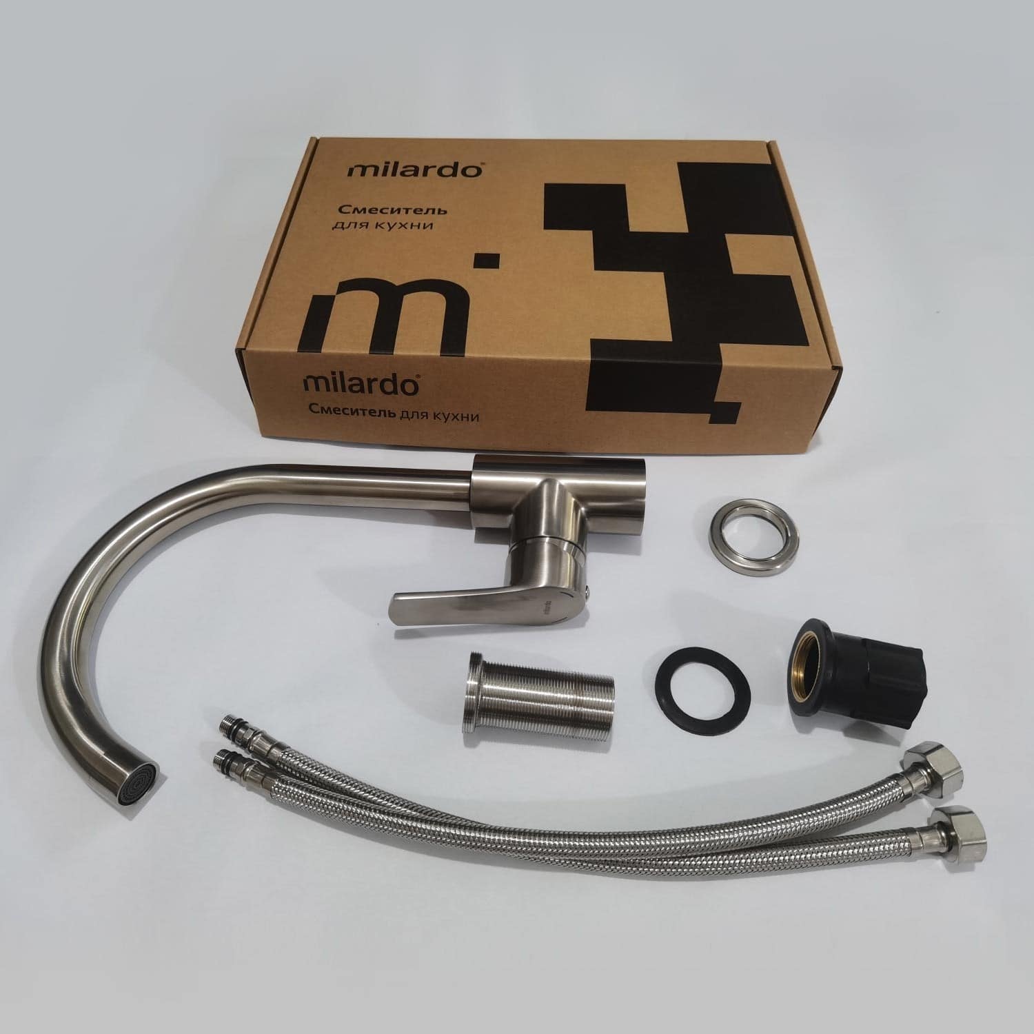Смеситель для кухни, однозахватный, латунь, PVD покрытие, цвет - сатин, керамический картридж 35 мм, пластиковый аэратор. В комлекте: гибкая подводка, крепёж. Упаковка: коробка, микрогофрокартон, индивид. мешок.