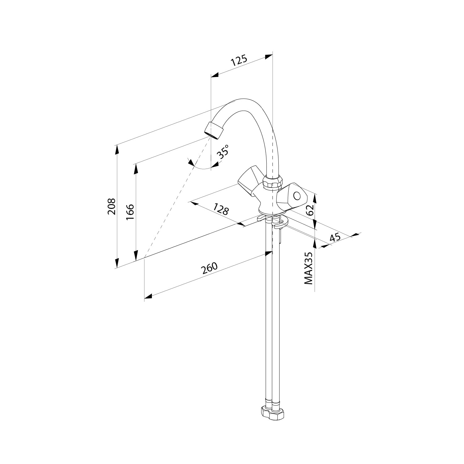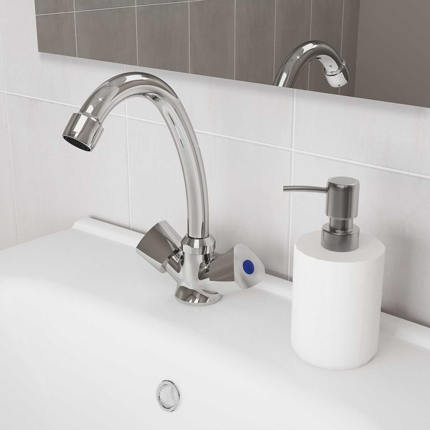 Смеситель для умывальника, двухзахватный, латунь, никель-хромовое покрытие, керамические кранбуксы, пластиковый аэратор.