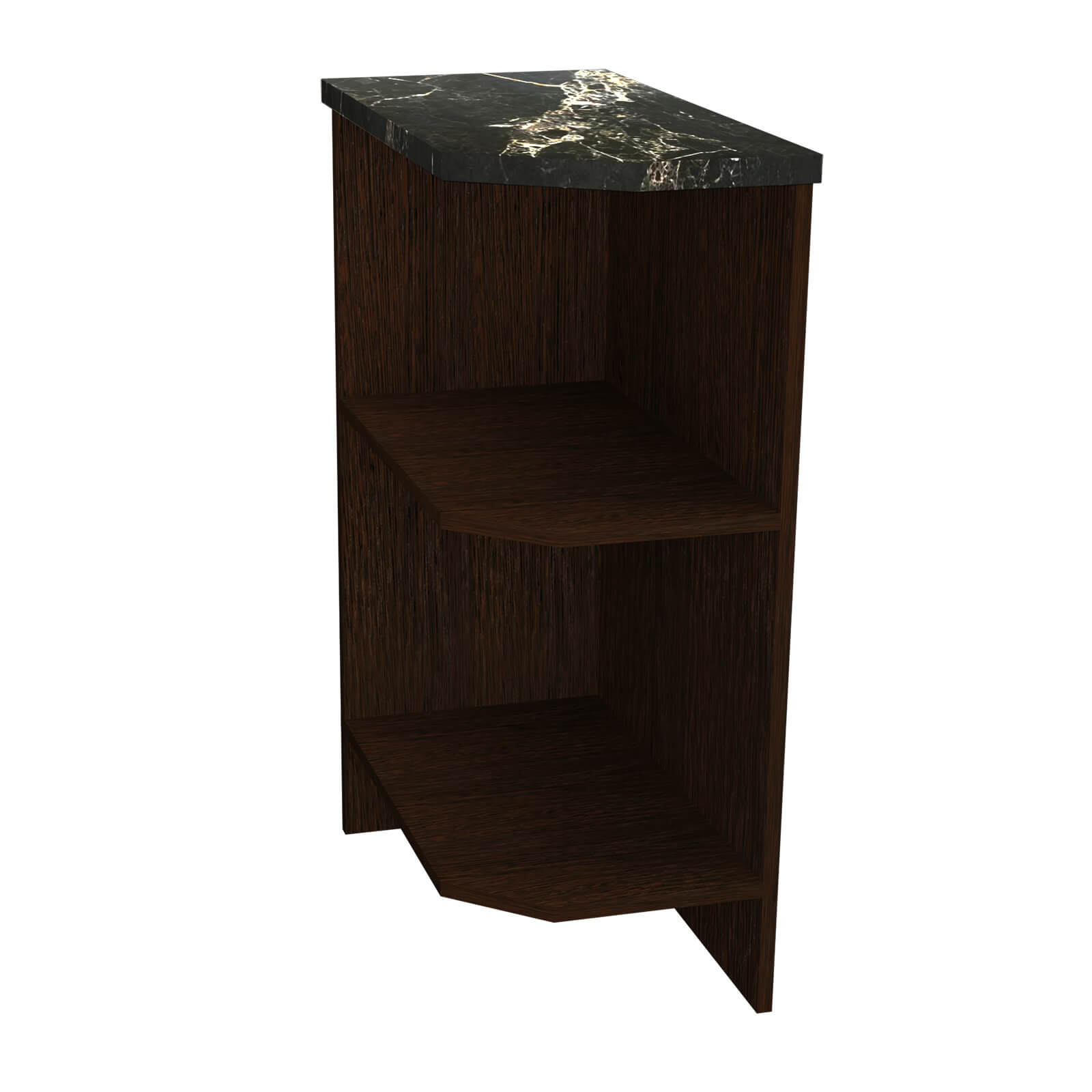 Стол имеет нестандартную форму и угловую конструкцию, что позволяет его использовать в небольших помещениях, экономя пространство.