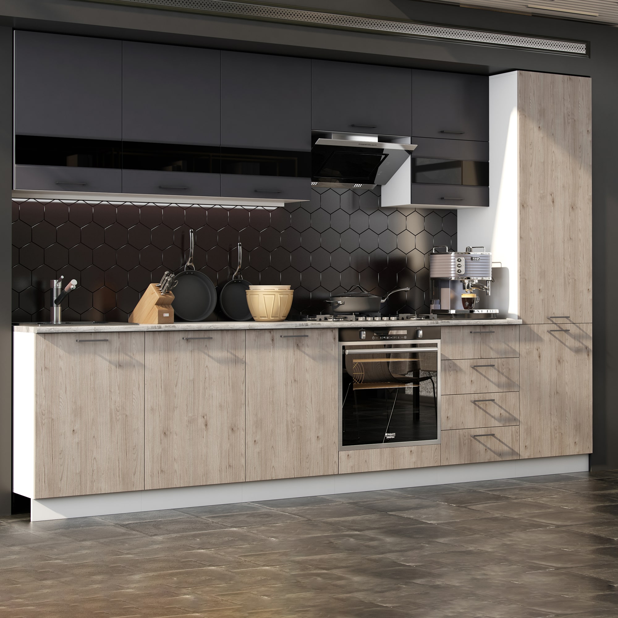 Кухня Астра 3100 Графит софт/Дуб галиано, материал корпуса - ЛДСП, габариты 3100x600x2140 мм.
