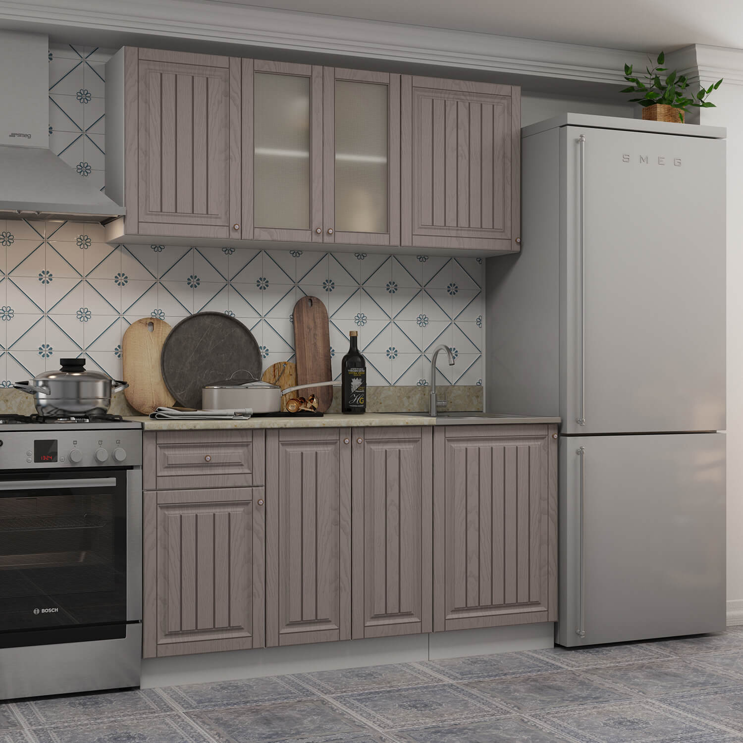 В комплект кухни входят: столешница, шкаф напольный с полками, шкаф напольный под мойку, шкаф напольный с ящиками, шкаф настенный, шкаф настенный под сушку, шкаф-витрина настенный. Материал корпуса - ЛДСП, материал фасада - МДФ/стекло, материал столешницы - ЛДСП, материал фурнитуры - металл. Толщина столешницы составляет 26 мм.