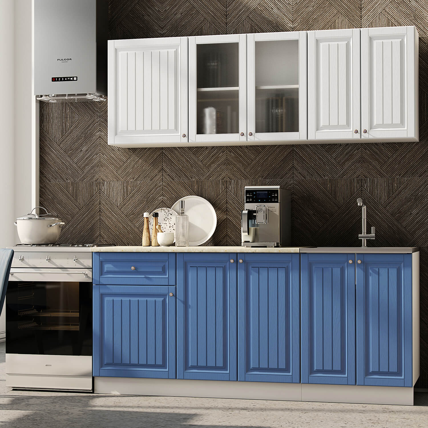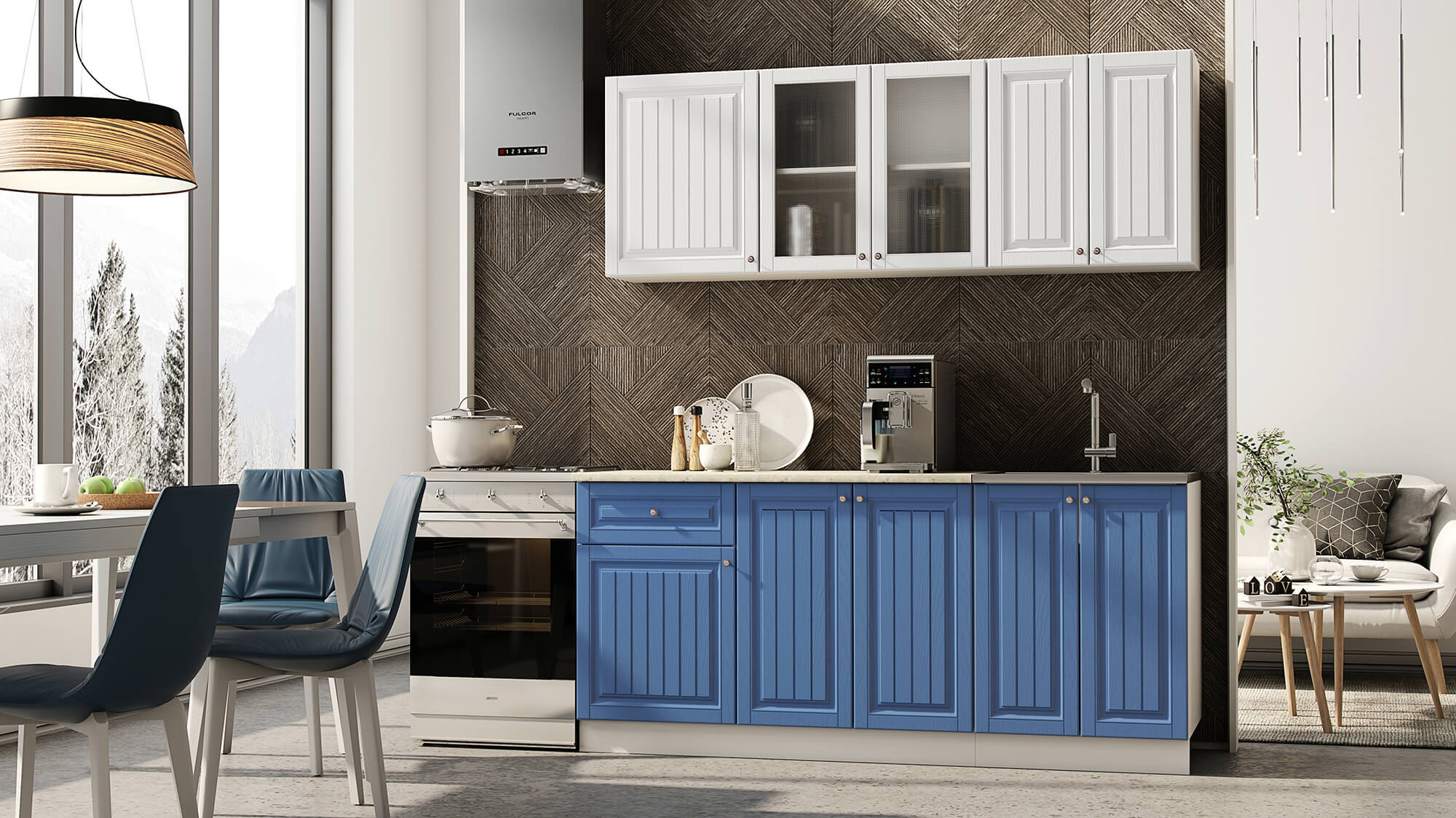 Кухня Хозяюшка 1,8 Акация Белая-Деним доступна к заказу в различных цветовых исполнениях, подходящих к любому интерьеру обеденной зоны.