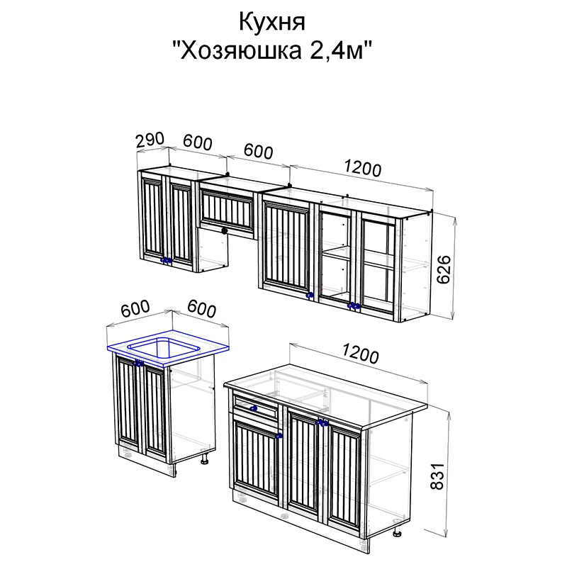 Кухня Хозяюшка 2,4 Акация Белая, материал корпуса - ЛДСП, габариты 2400x600x2100 мм.