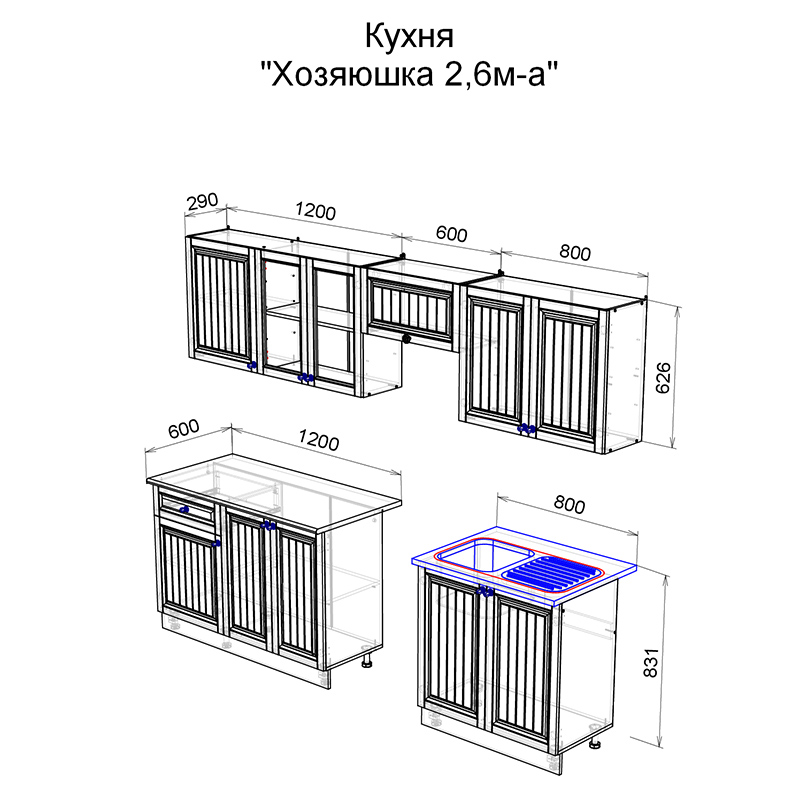 Кухня Хозяюшка 2,6 Трюфель, материал корпуса - ЛДСП, габариты 2600x600x2100 мм.