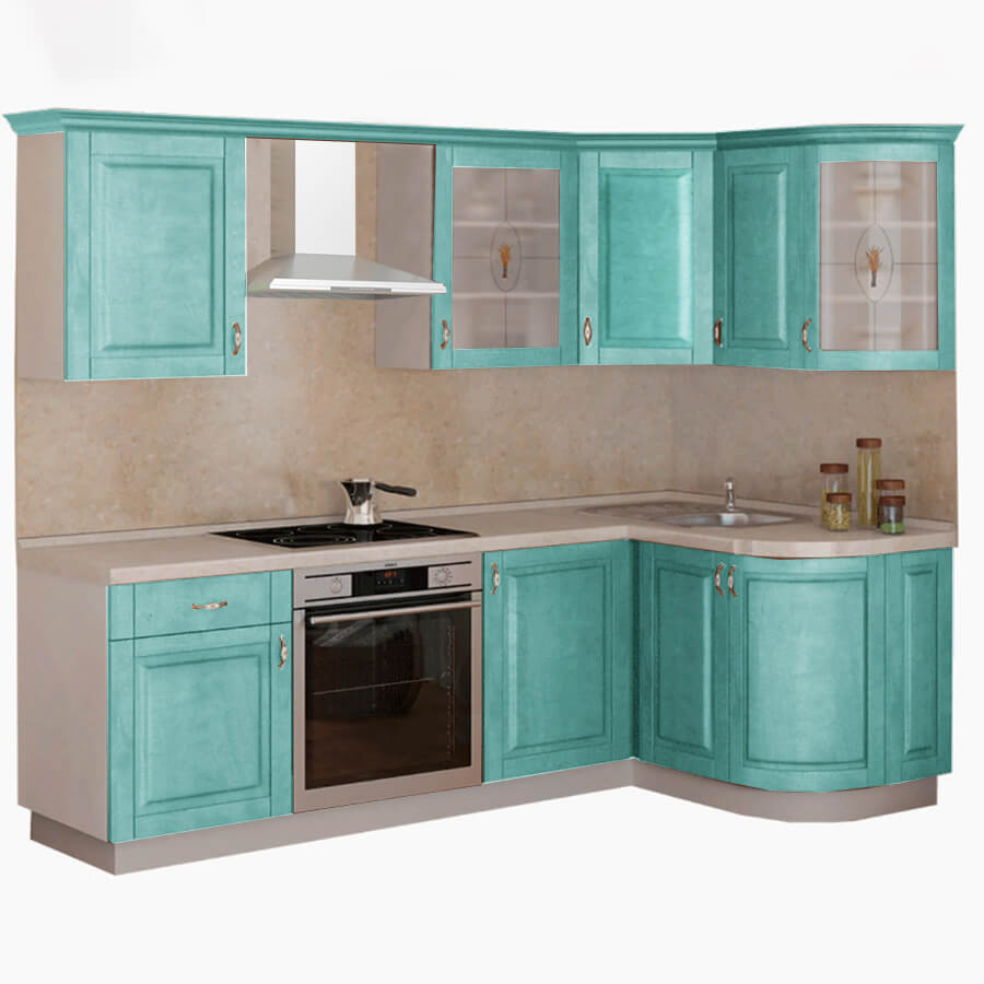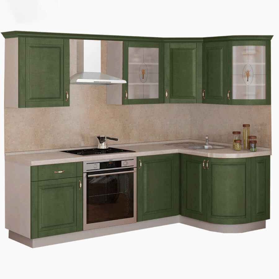 Кухня Массив угловая 1600х1335 правая витраж доступна к заказу в различных цветовых исполнениях, подходящих к любому интерьеру обеденной зоны.