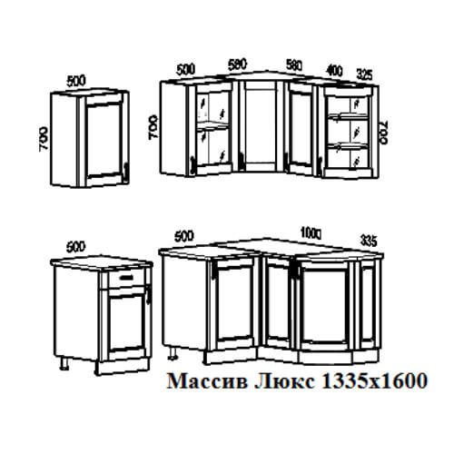 Кухня Массив угловая 1600х1335 правая витраж, материал корпуса - ЛДСП, габариты 1600x1335x2100 мм.