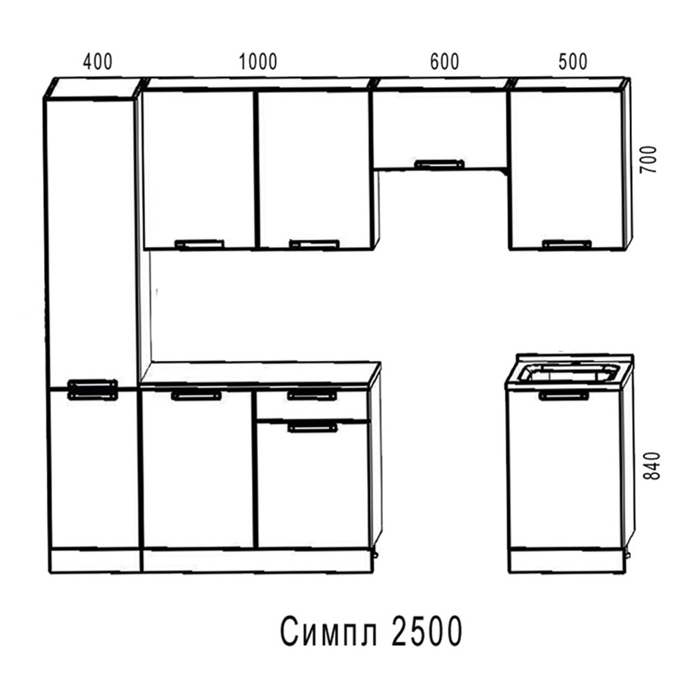 Кухня Симпл 2500, материал корпуса - ЛДСП, габариты 2500x600x2100 мм. Кухонные гарнитуры Симпл от фабрики Боровичи-мебель – это бюджетный вариант для практичных людей. Высокое качество материалов, функциональность и современное цветовое решение прекрасно соотносятся с разумной ценой.  Кухни Боровичи сделают Ваш дом уютным, удобным и красивым и при этом у Вас не останется впечатления, что Вы переплатили. Кухня Симпл станет самой выгодной Вашей покупкой!