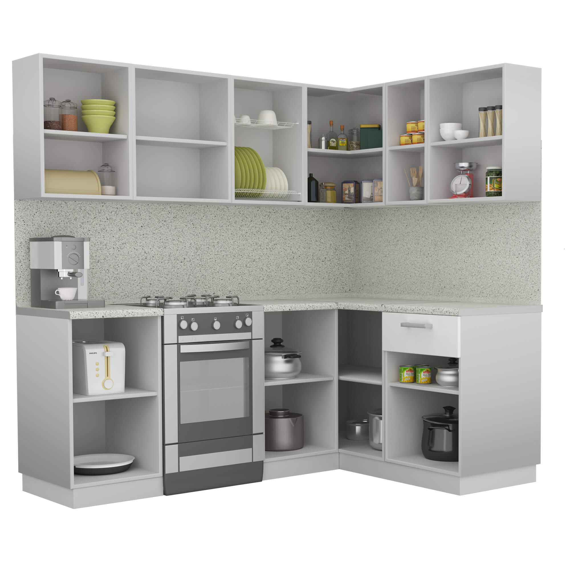 Сама кухня пришла в разобранном виде, все шкафы в коробках с фурнитурой и инструкцией. Петли все вместе в одном пакете с планками, заглушками и прочим. Сушилку привезли просто упакованную в полиэтилен. Но, все доехало в полном комплекте.