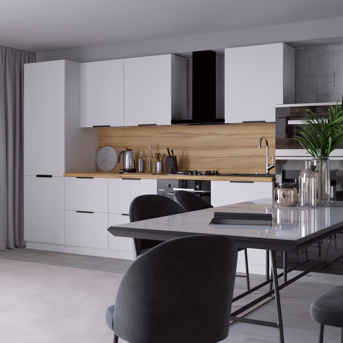 Кухня Сити 3000 Белый матовый доступна к заказу в различных цветовых исполнениях, подходящих к любому интерьеру обеденной зоны.