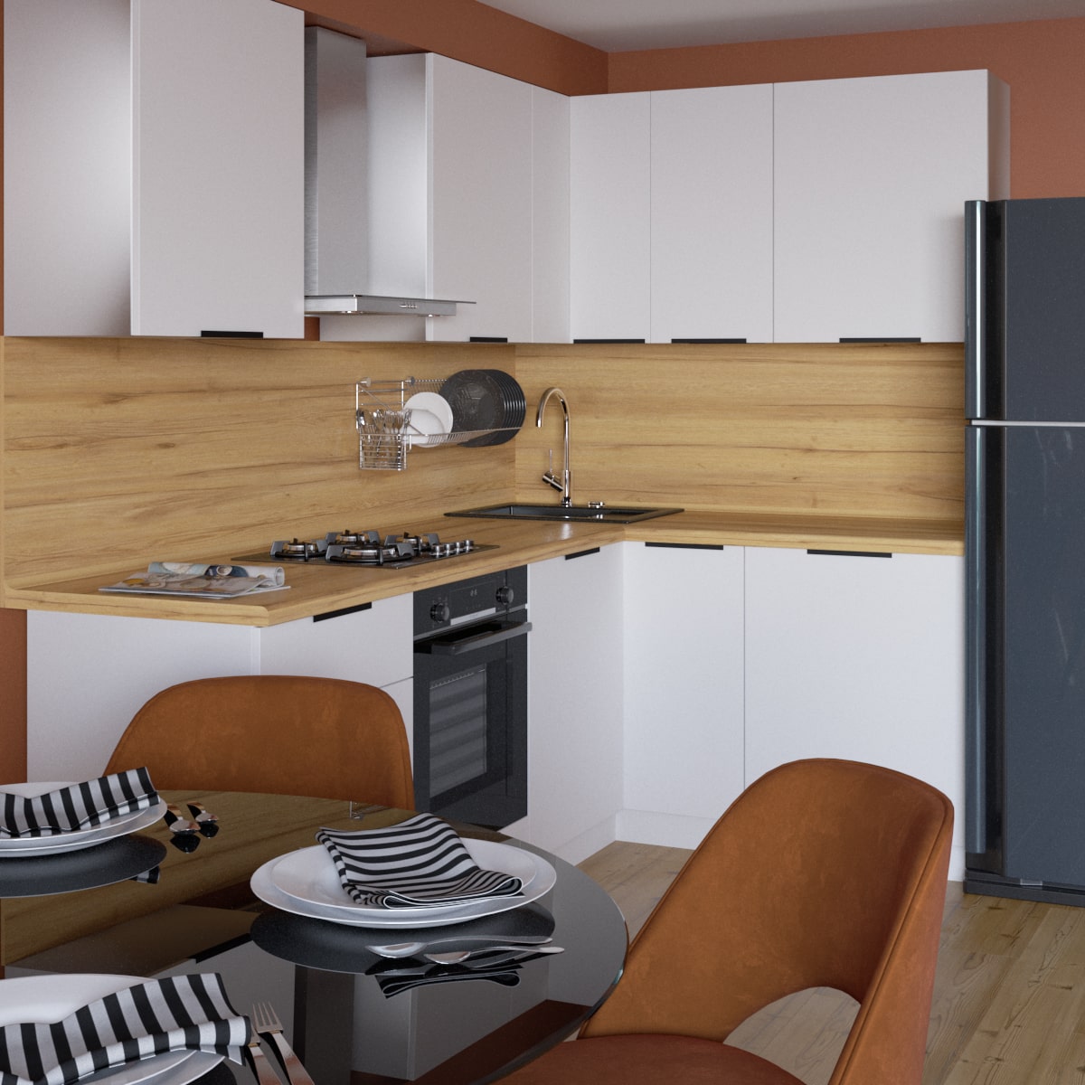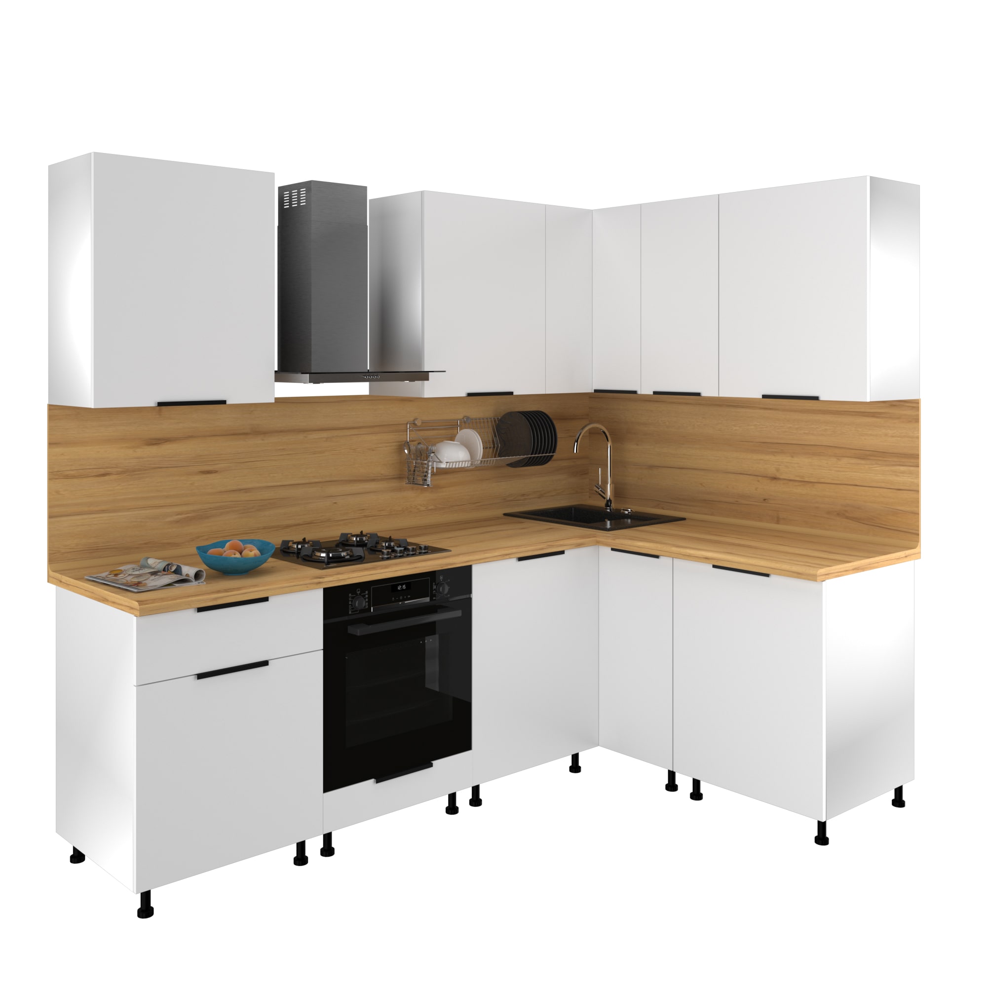 Угловая кухня “Сити” представляет собой идеальное сочетание элегантности и практичности. Она выполнена в современном стиле, что делает ее универсальной для любого интерьера и позволяет легко сочетать с другими элементами декора. Фасады кухни изготовлены из высококачественного МДФ, благодаря чему они обладают повышенной устойчивостью к повреждениям и легко чистятся. Контрастные черные ручки придают кухне гармоничное и стильное завершение.