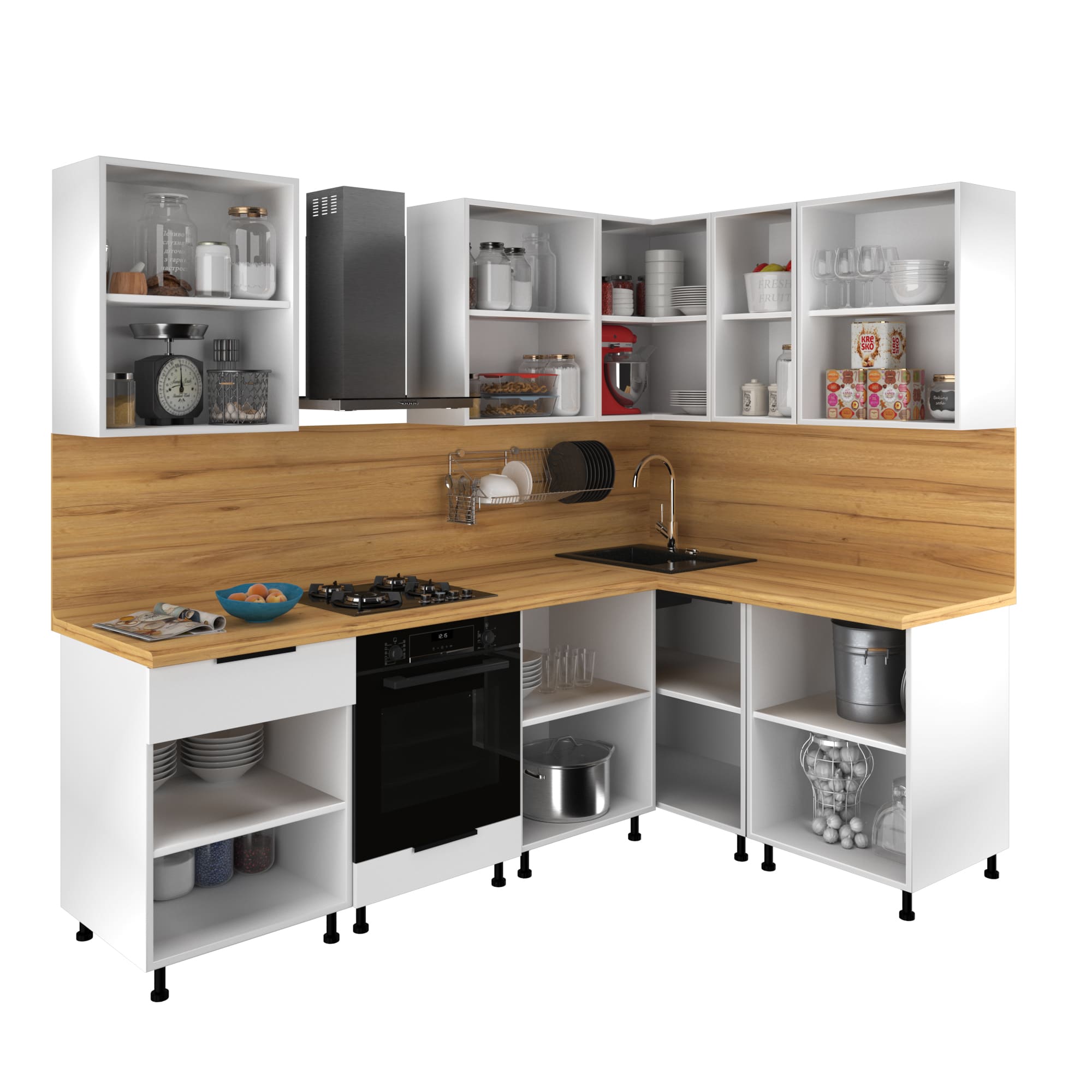 Внутри кухня оснащена множеством полок, выдвижных ящиков для хранения посуды, продуктов и кухонной утвари. Это позволяет максимально эффективно использовать пространство и обеспечивает порядок на кухне.