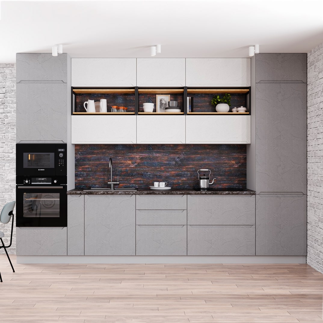 Кухонный гарнитур Тренто 3400 Штукатурка белая/Штукатурка серая доступна к заказу в различных цветовых исполнениях, подходящих к любому интерьеру обеденной зоны.