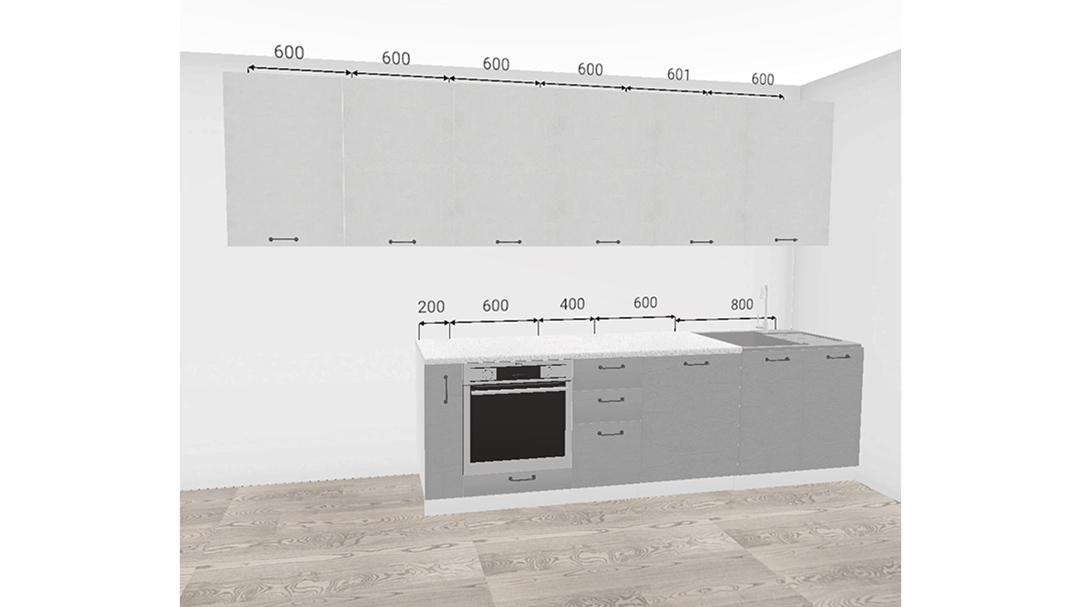 Кухонный гарнитур Лофт 3600 Штукатурка белая/Штукатурка серая, материал корпуса - ЛДСП, габариты 3600x600x2350 мм.