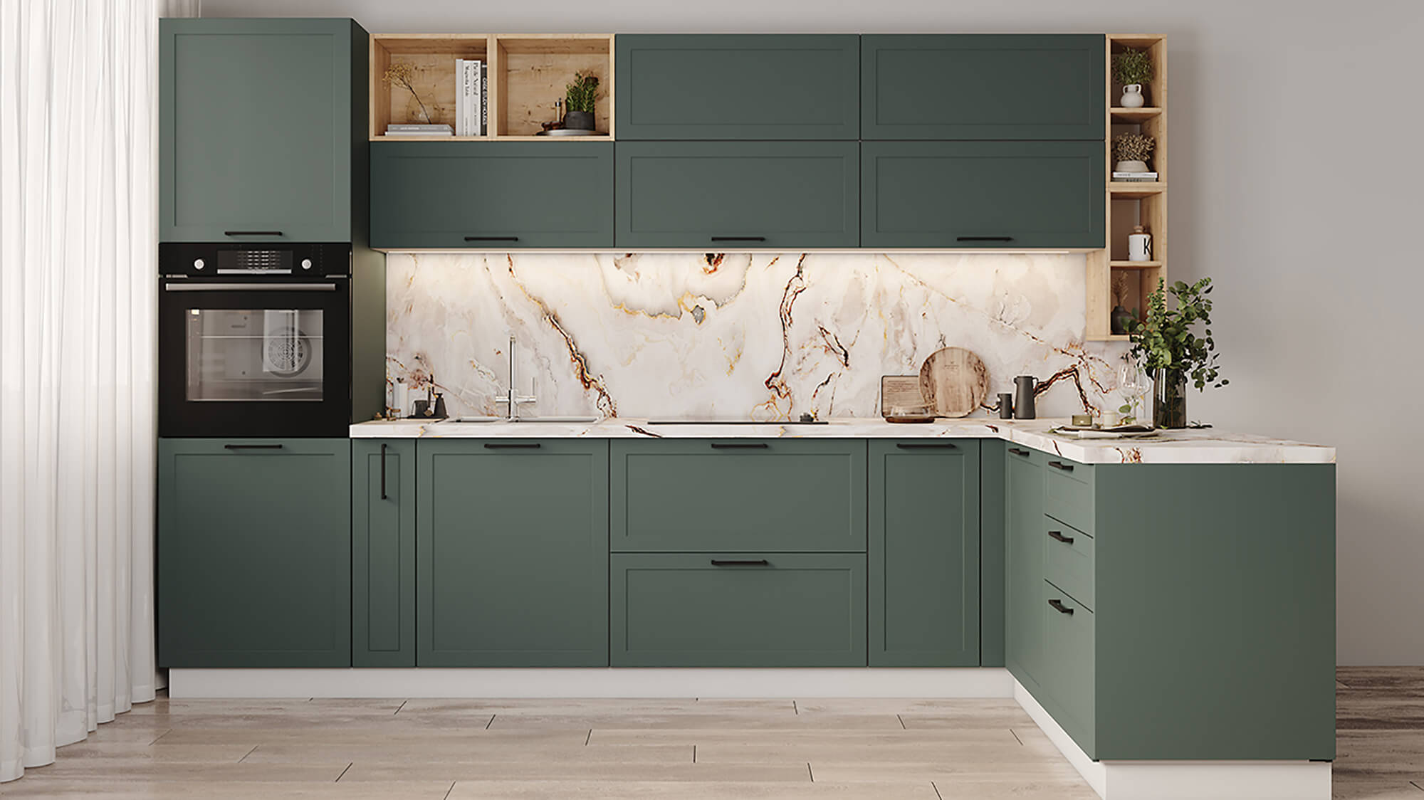 Кухни Перо — новая линейка кухонь NORMA в пленках уникальной устойчивости. Это ПВХ пленка, которая объединила в себе преимущества премиального внешнего вида эмали и устойчивость к механическим повреждениям и агрессивным веществам от ПЭТ. Такие фасады имеют гладкую, тактильно приятную поверхность, которая полностью повторяет эффект эмали.