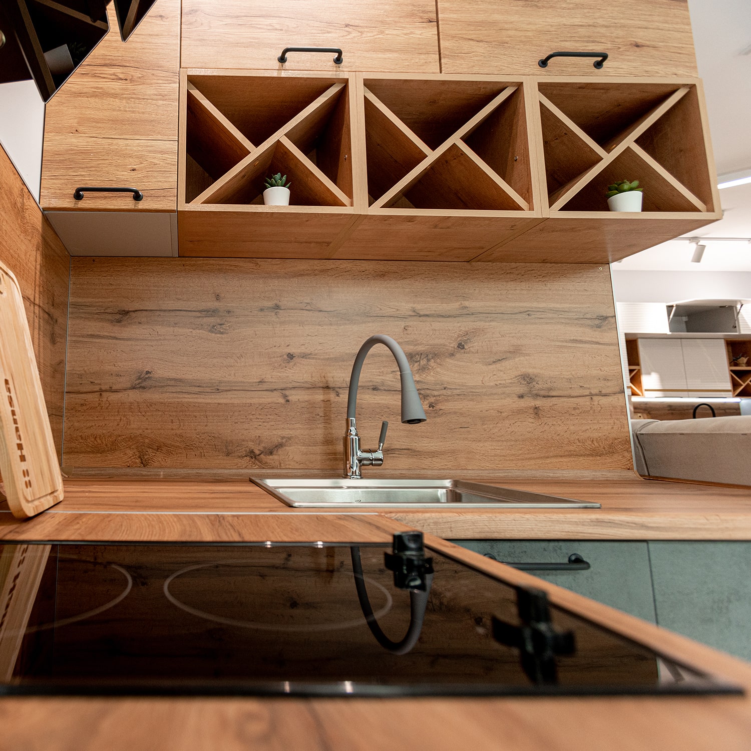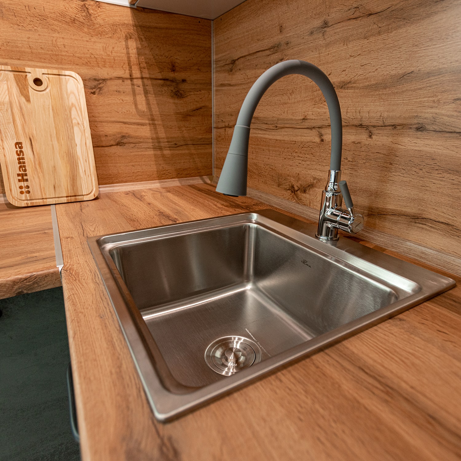 В комплект входит: верхние и нижние модули, столешница 38 мм (Дуб золотой), стеновая панель, мойка врезная 4948 MELANA ЛЮКС 1,0/220 САТИН, смеситель для кухни Accona A9890T-1 Серый/Хром.