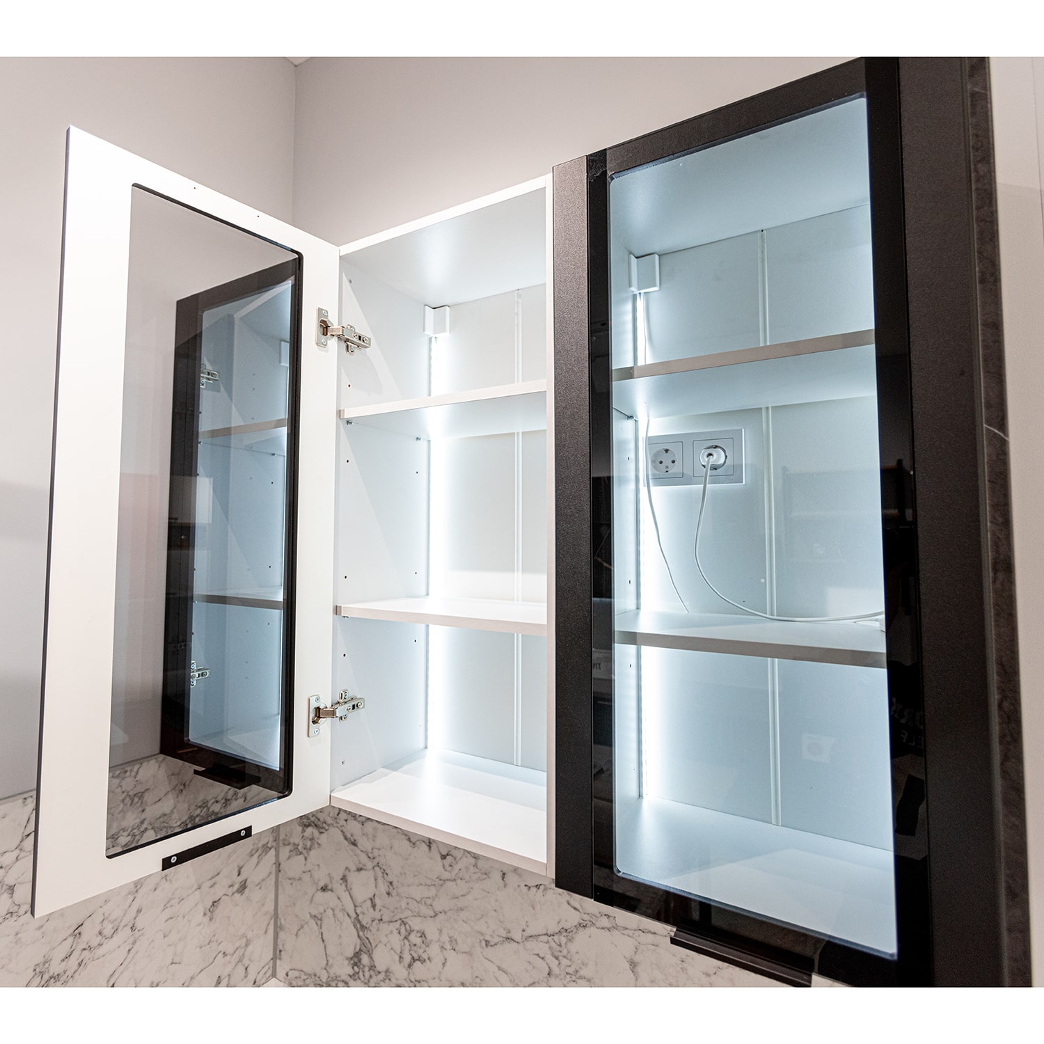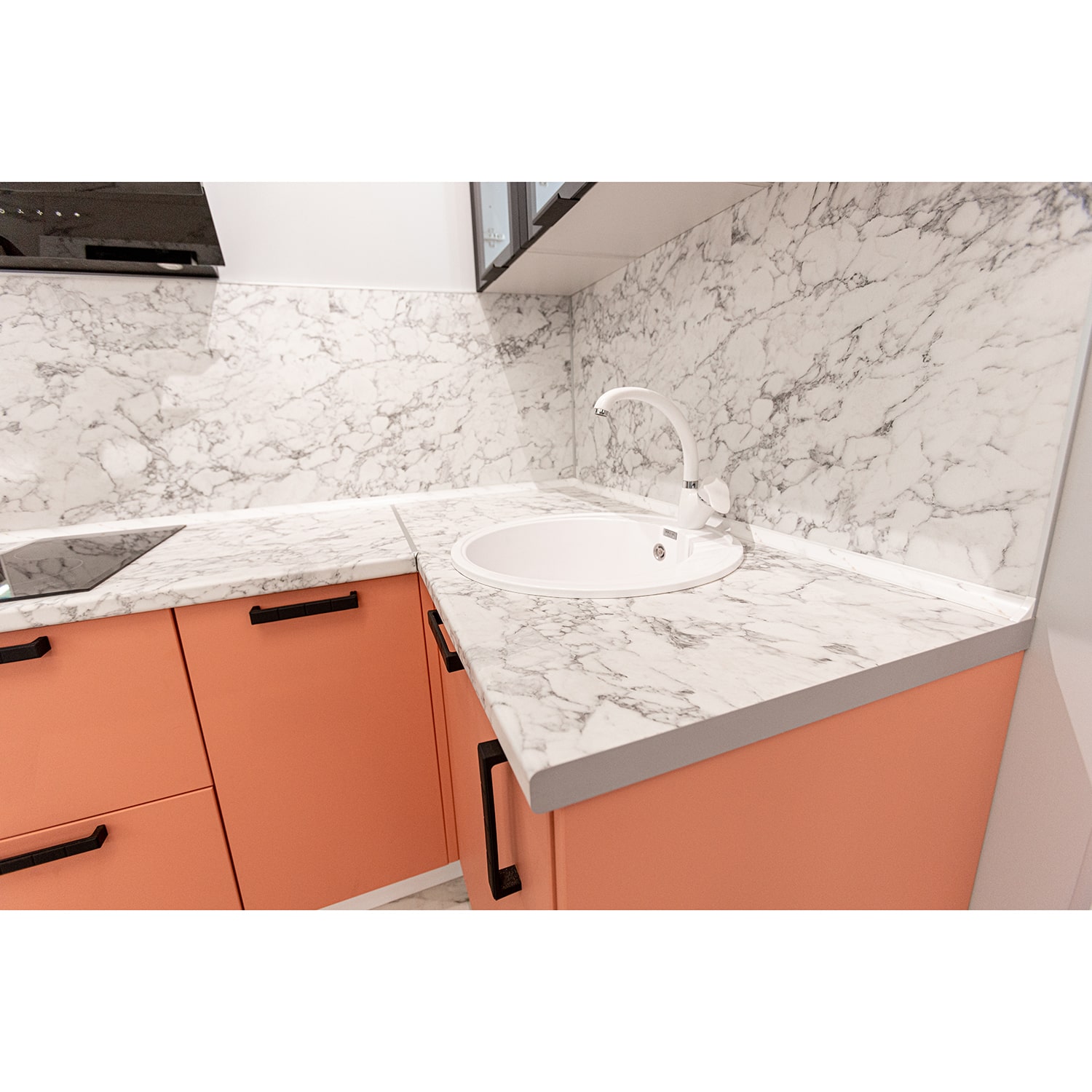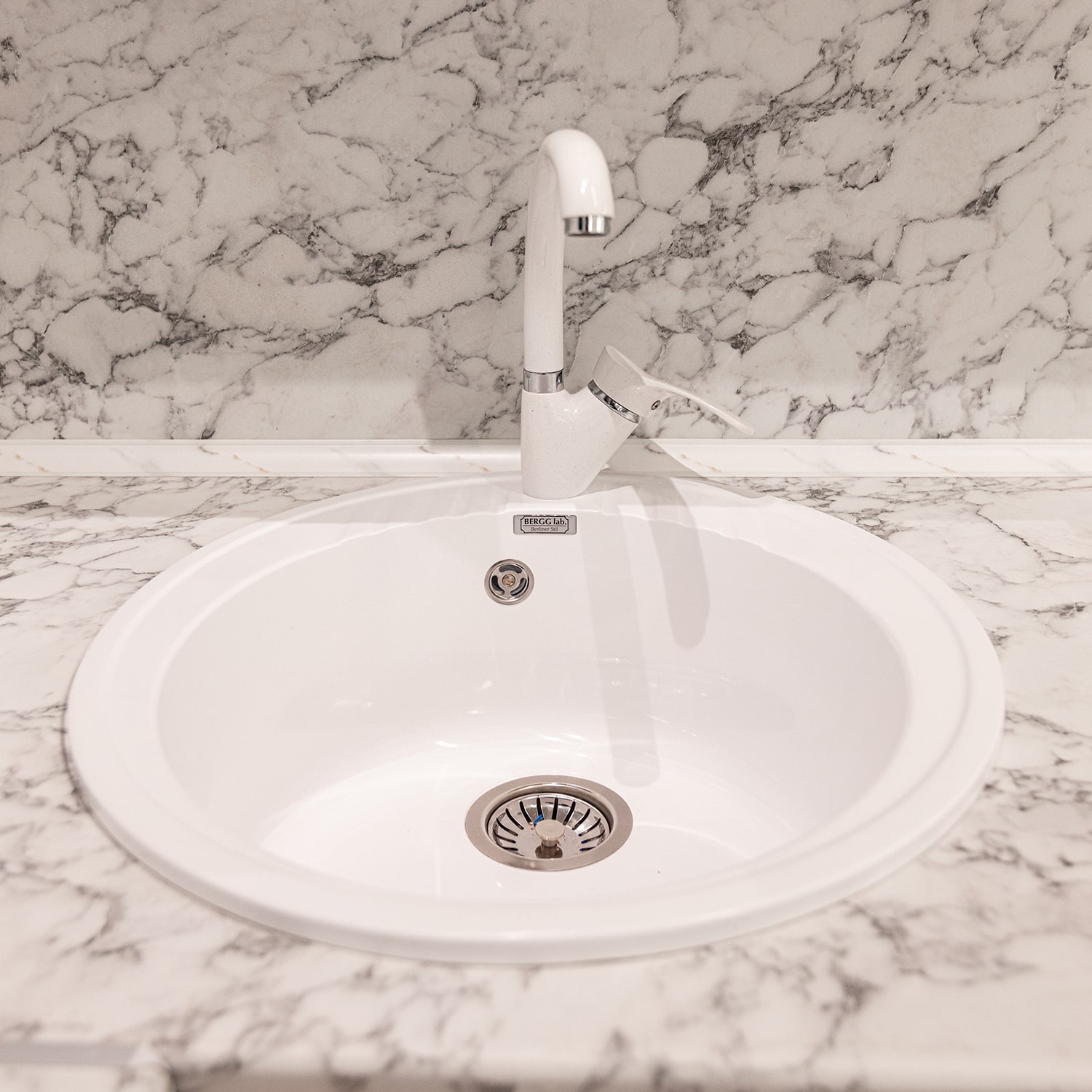 В комплект входит: верхние и нижние модули, столешница 38 мм (Белый мрамор), стеновая панель, кухонная мойка глянцевая BERGG Z6 (цвет - Белый лед), смеситель глянцевый BERGG MG009, подсветка.