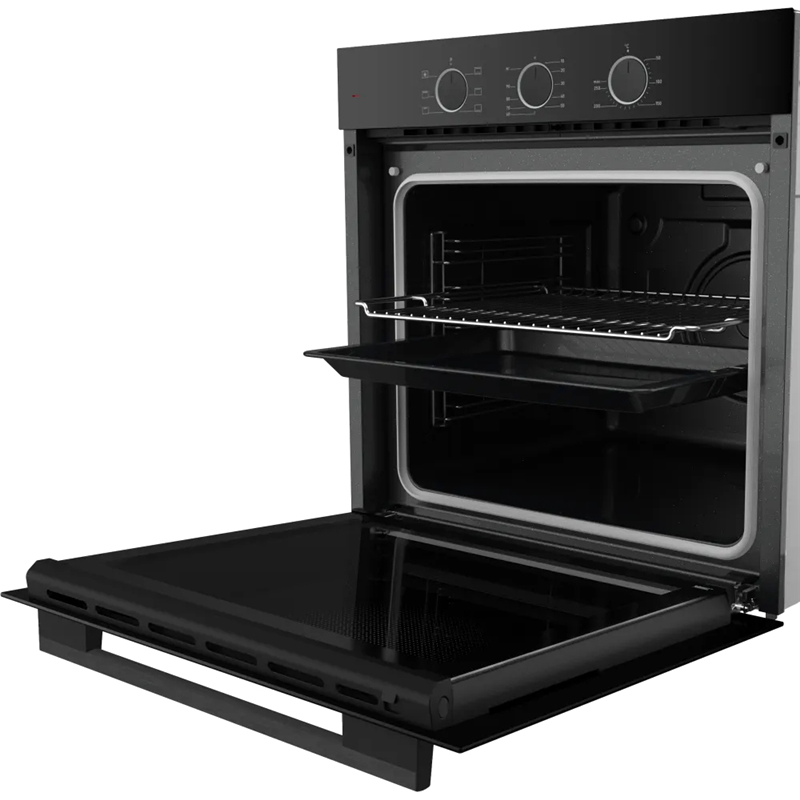 Дверца духового шкафа и внутреннее стекло снимаются, что значительно упрощает процесс очистки. Хромированные направляющие для противней обеспечивают легкое скольжение посуды, а съемная конструкция дает возможность быстро извлекать их для мытья. Два слоя закаленного стекла в дверце эффективно удерживают тепло внутри камеры и гарантируют безопасность при работе с высокими температурами.
