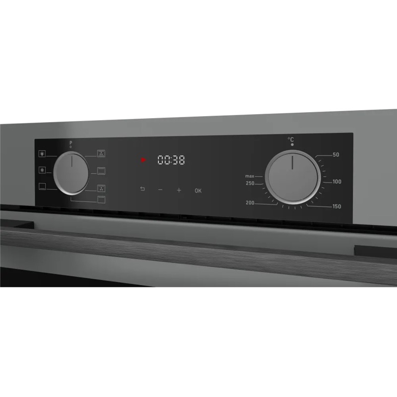 Управление производится при помощи двух утапливаемых поворотных переключателей и сенсорного дисплея. Электронный таймер дает возможность задавать продолжительность приготовления. Гидролизная система очистки в сочетании с эмалью Easy Clean сокращают время ухода за духовкой —достаточно протереть внутренние поверхности влажной тканью после остывания. Встроенное освещение позволяет контролировать процесс приготовления без необходимости открывать дверцу, сохраняя температурный режим.